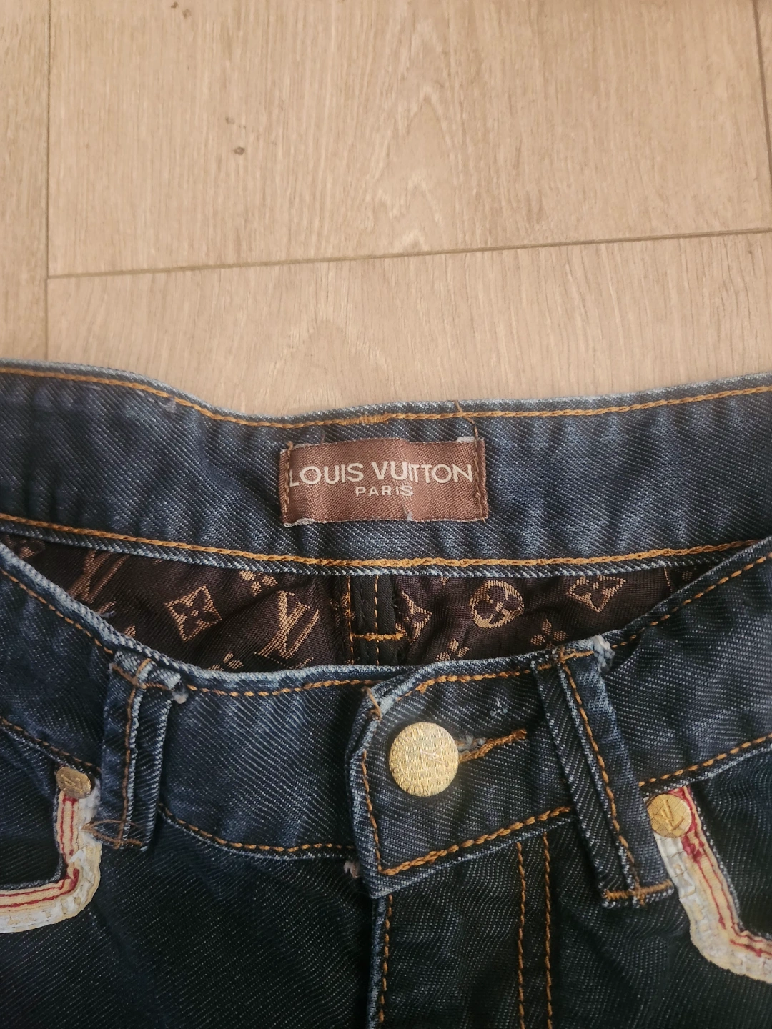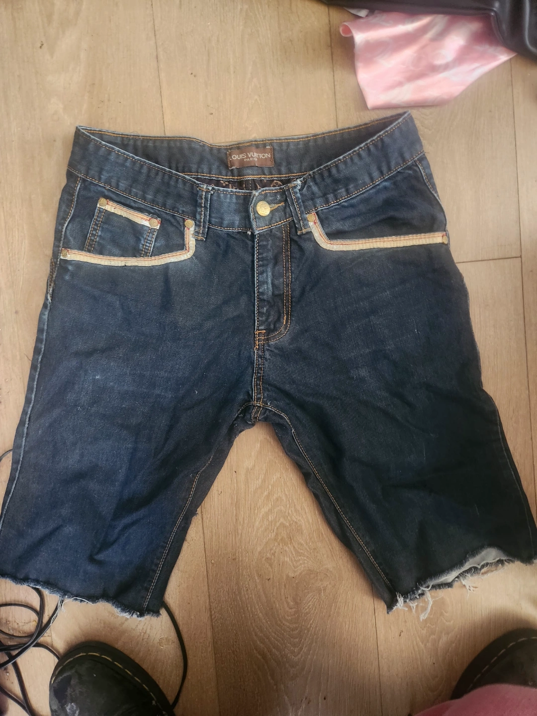 Pre-owned Louis Vuitton denim shorts. Dark wash denim. Distressed hems. Unique detailing. Designer label visible. * Cash Only * * No E-transfers * * Pickup Only * * Serious Offers Only *