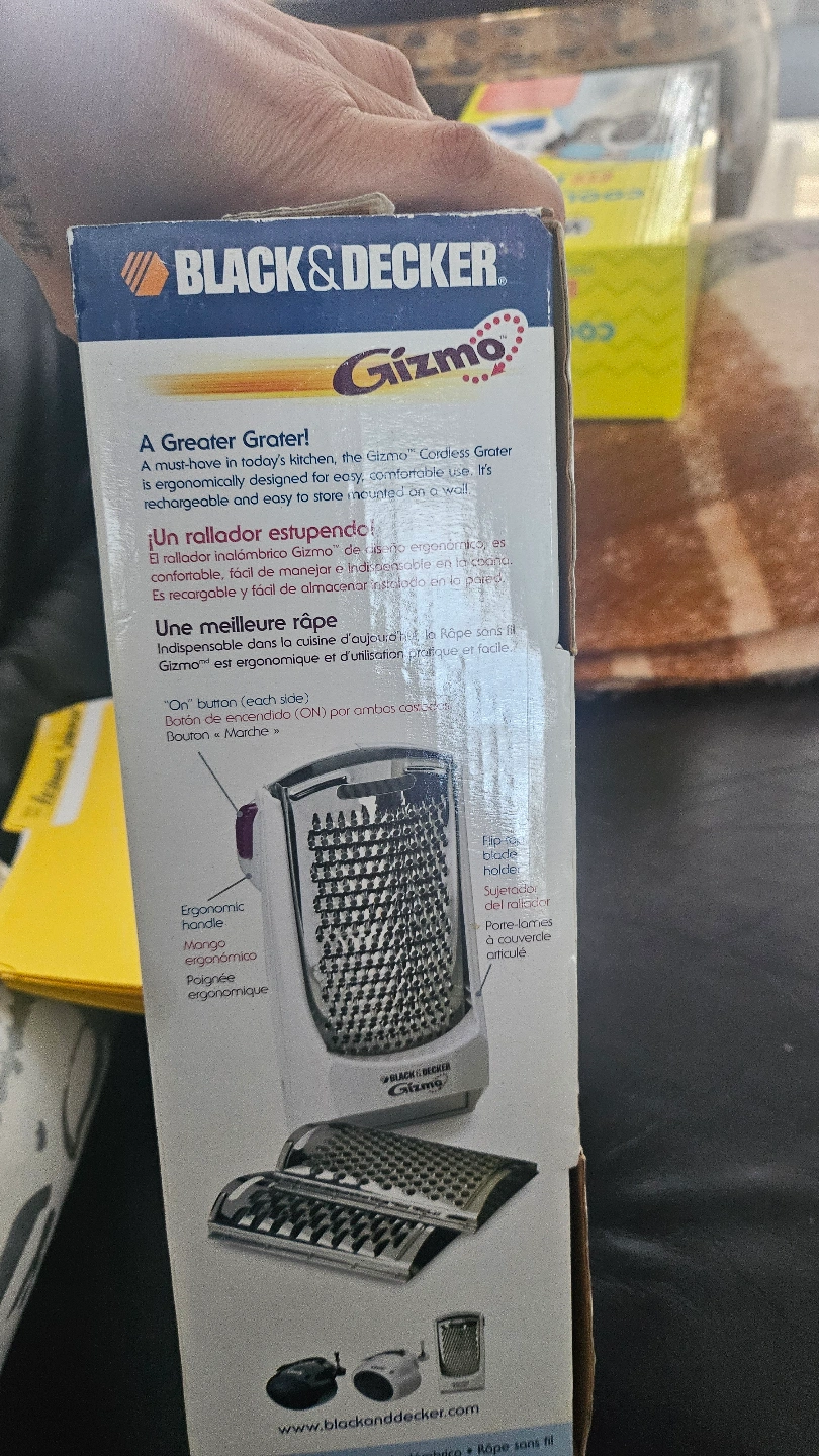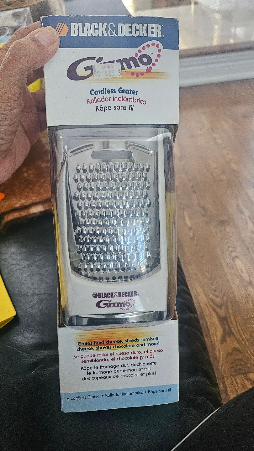 New in box Black & Decker Gizmo cordless grater. Grates hard cheese, shreds soft cheese, and more. Rechargeable and easy to store. Features ergonomic handle and easy on/off button.