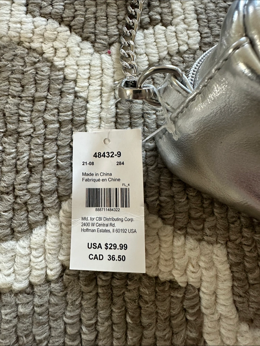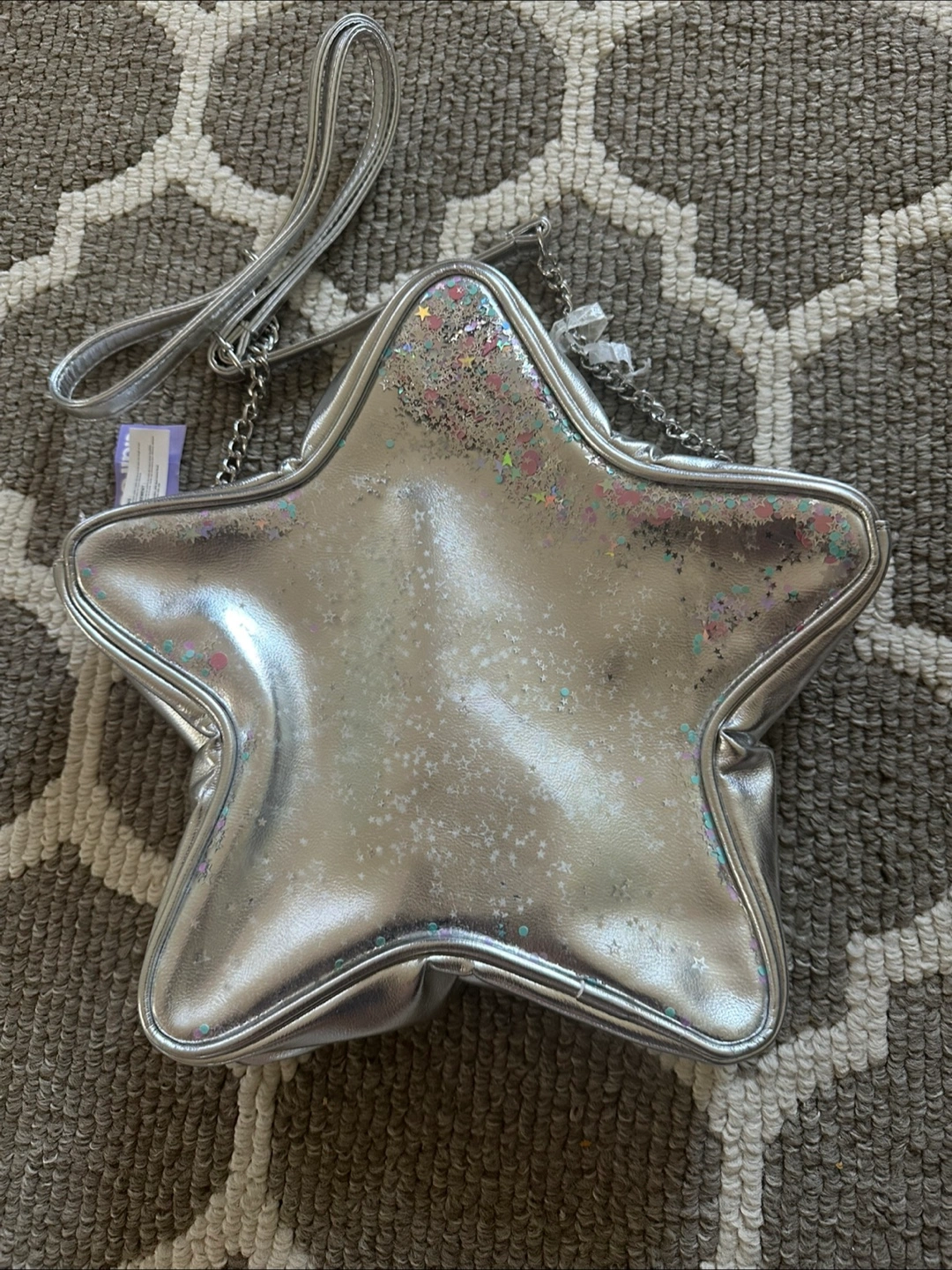 Adorable silver star-shaped crossbody bag. Features a sparkly finish and a removable shoulder strap. Perfect for everyday use or special occasions. Bought from Claire’s @$36.50+taxes.