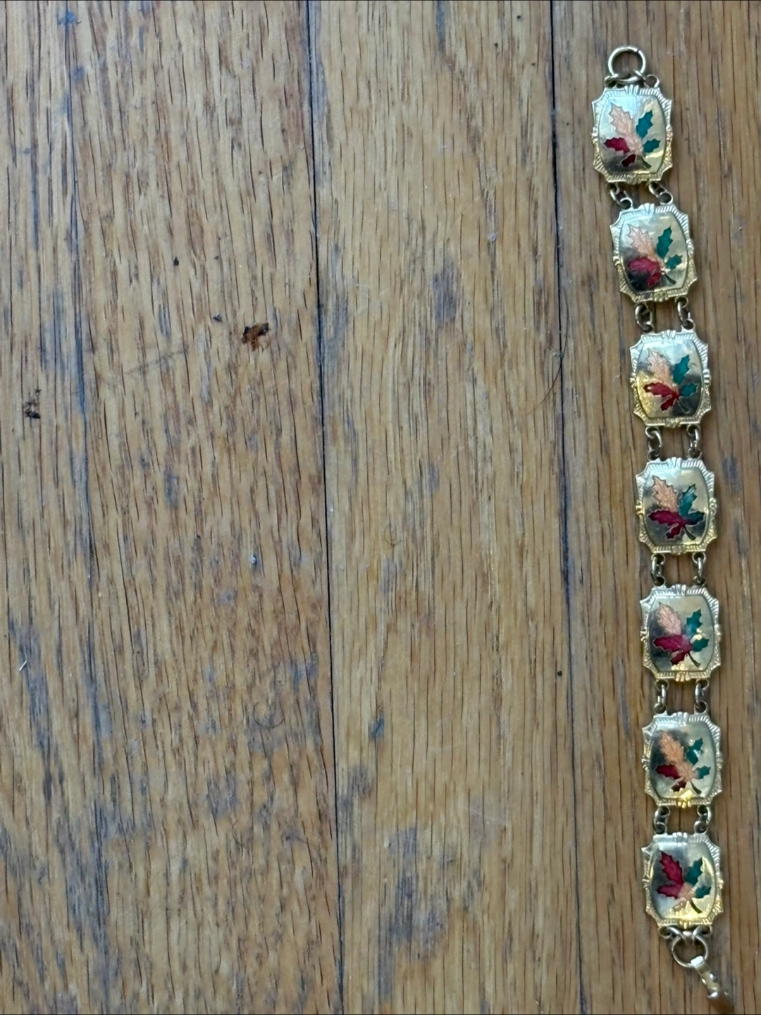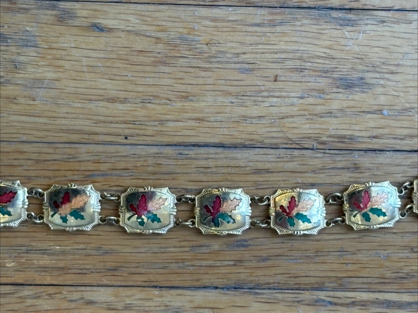 Gold-tone metal bracelet. Features seven square enamelled charms. Each charm depicts autumn leaves in red, green, and orange. Clasp closure. Unique design.