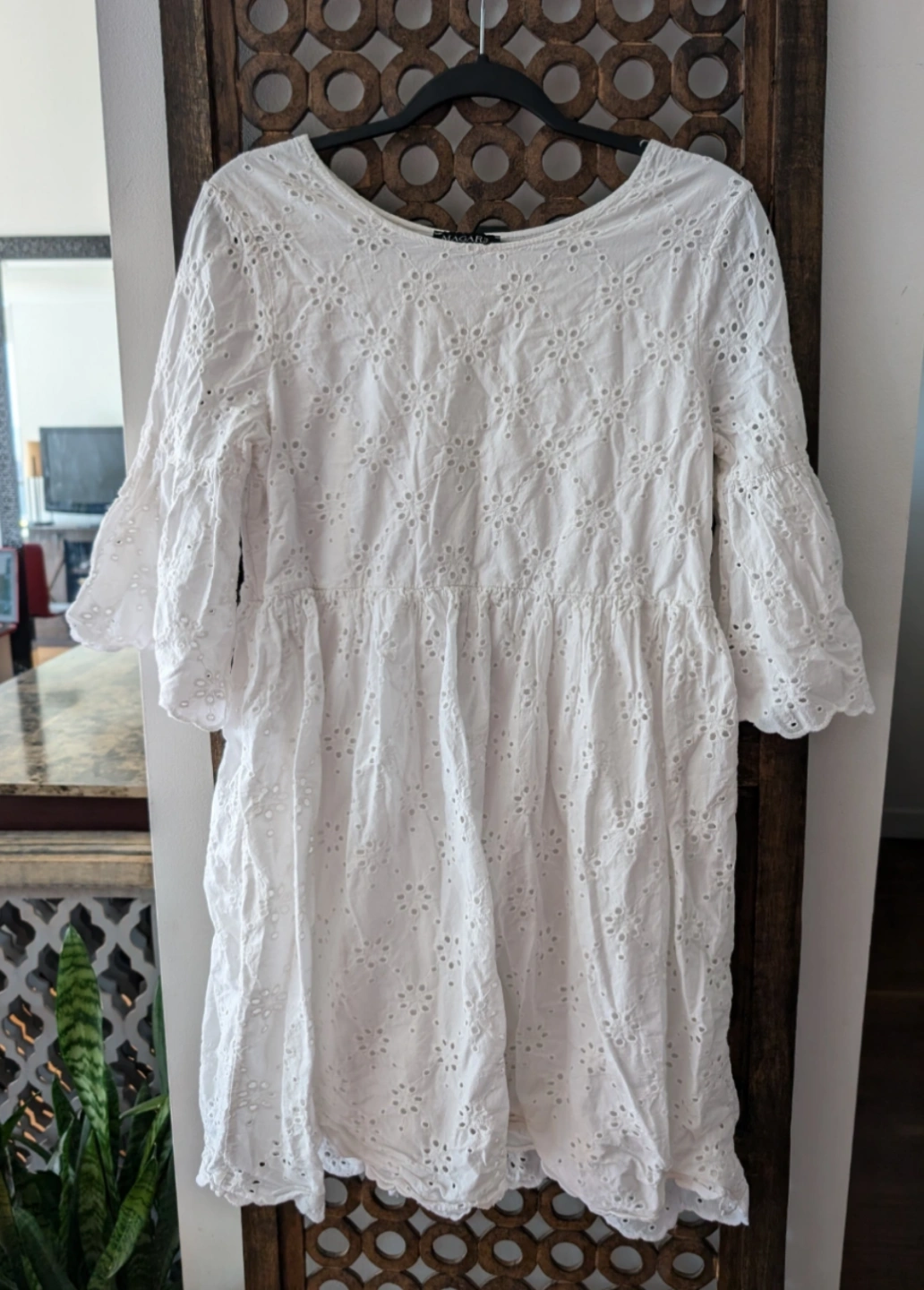 Beautiful eyelet dress. Made in Italy. Three-quarter sleeves. Round neckline Flowy fit, that can be sinched in with a cute belt too. Perfect for summer.