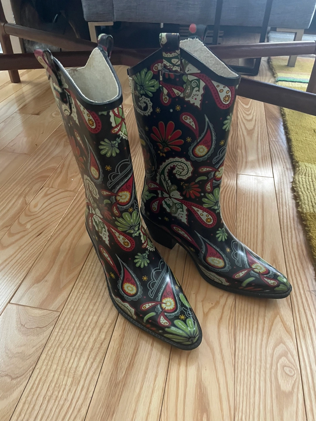 Pair of women's rain boots. Features a colourful paisley print. Cowboy style boots with a pointed toe. Mid-calf height.