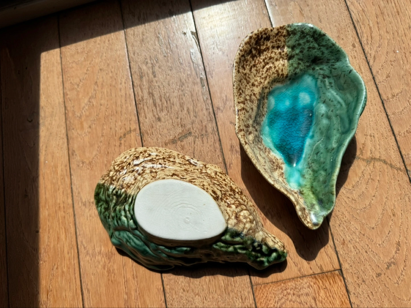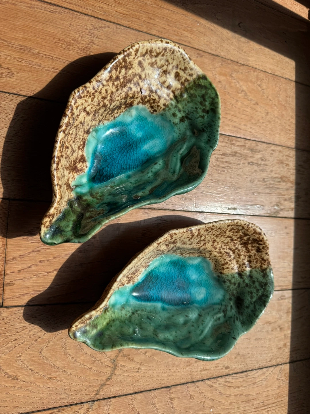 Two ceramic dishes shaped like oyster shells. Unique glaze colours. Great for serving sauces or small snacks.