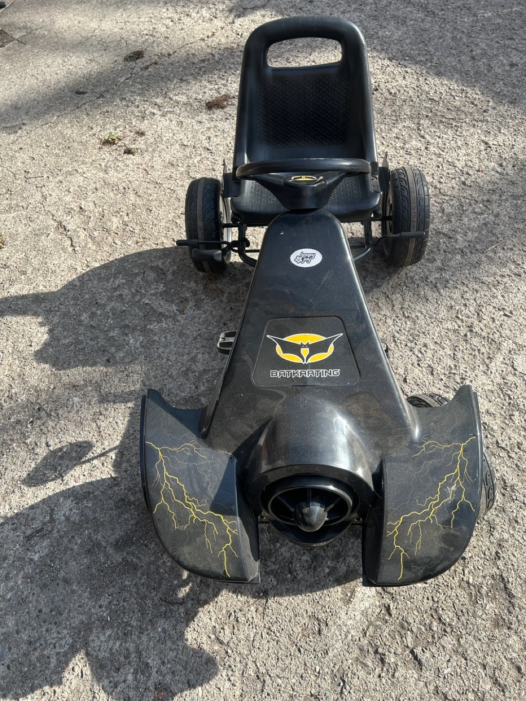 Black go-kart. Features Batman logo. Yellow lightning bolt accents. Four wheels. Foot-powered. Suitable for children. Used condition.