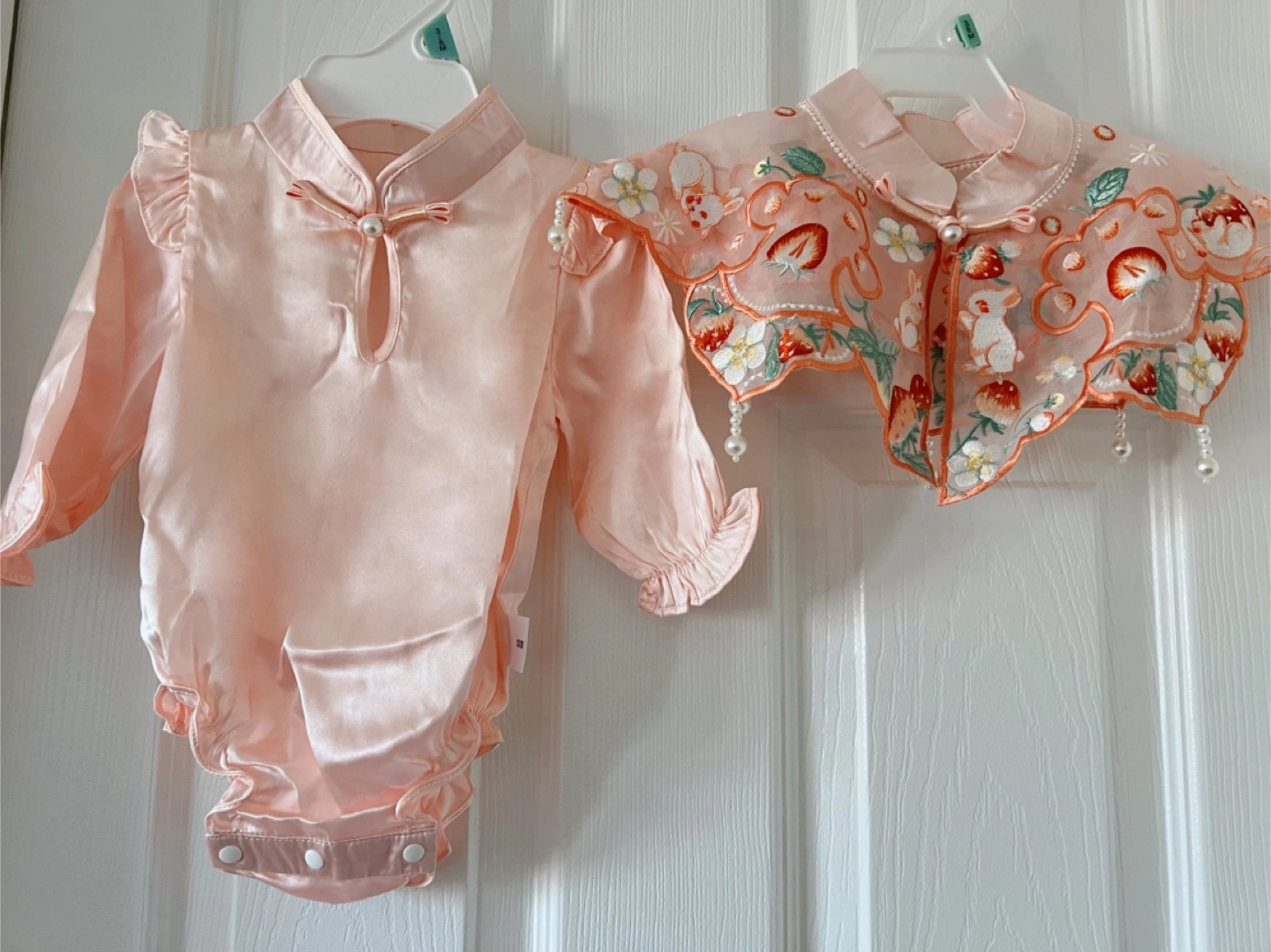 3-6month. material is silk, great for summer outfit or special occasions! Beautiful peach satin baby girl bodysuits.