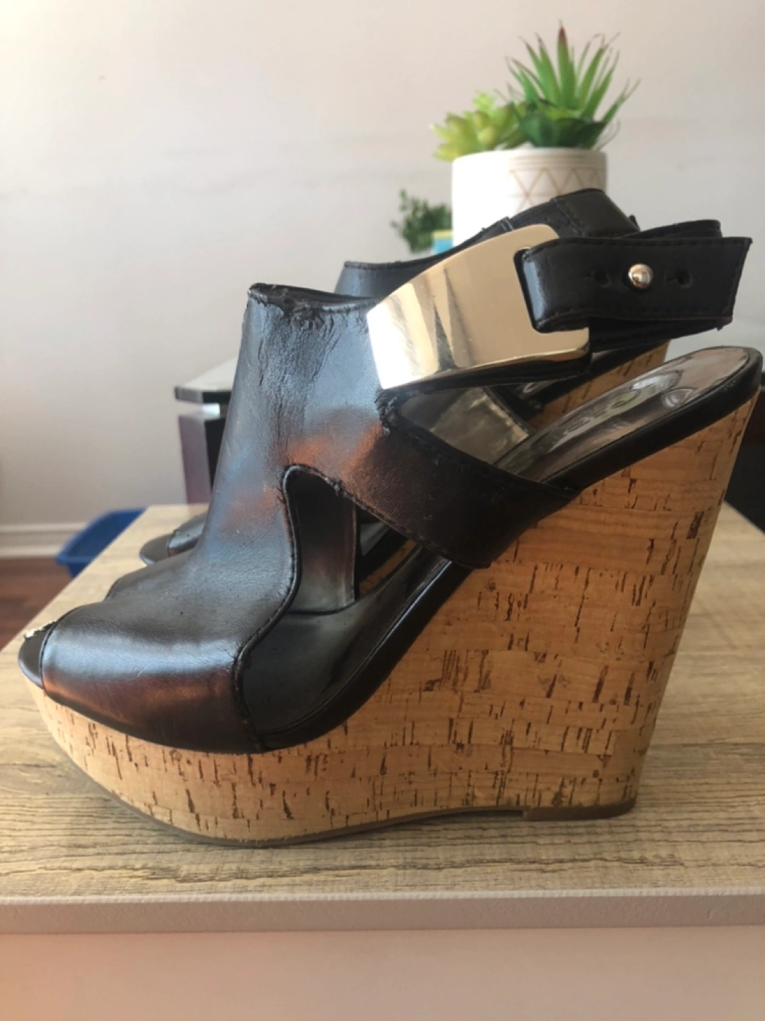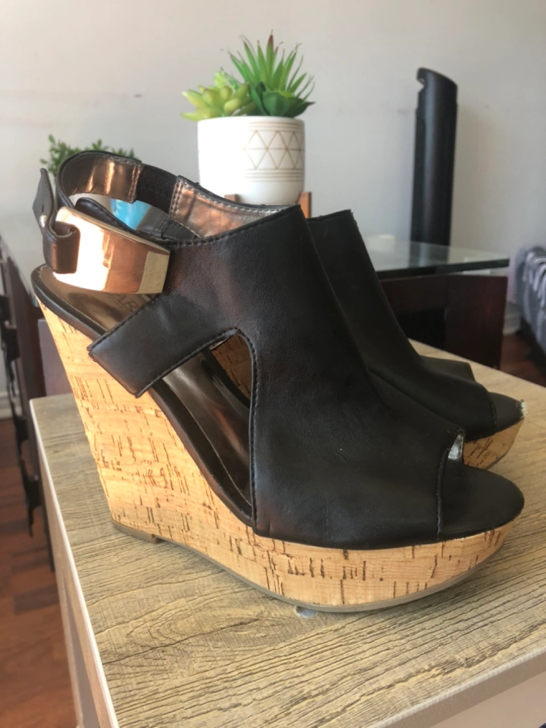 Never worn, so they are brand new! The only thing is one side as been bitten a little by my bunny that clearly saw I was never using them and used it as a chewing toy! Look at the last picture, your feet should be covering it when wearing them, it’s very minimal! Yes it’s free! Cleaning out my closet;)