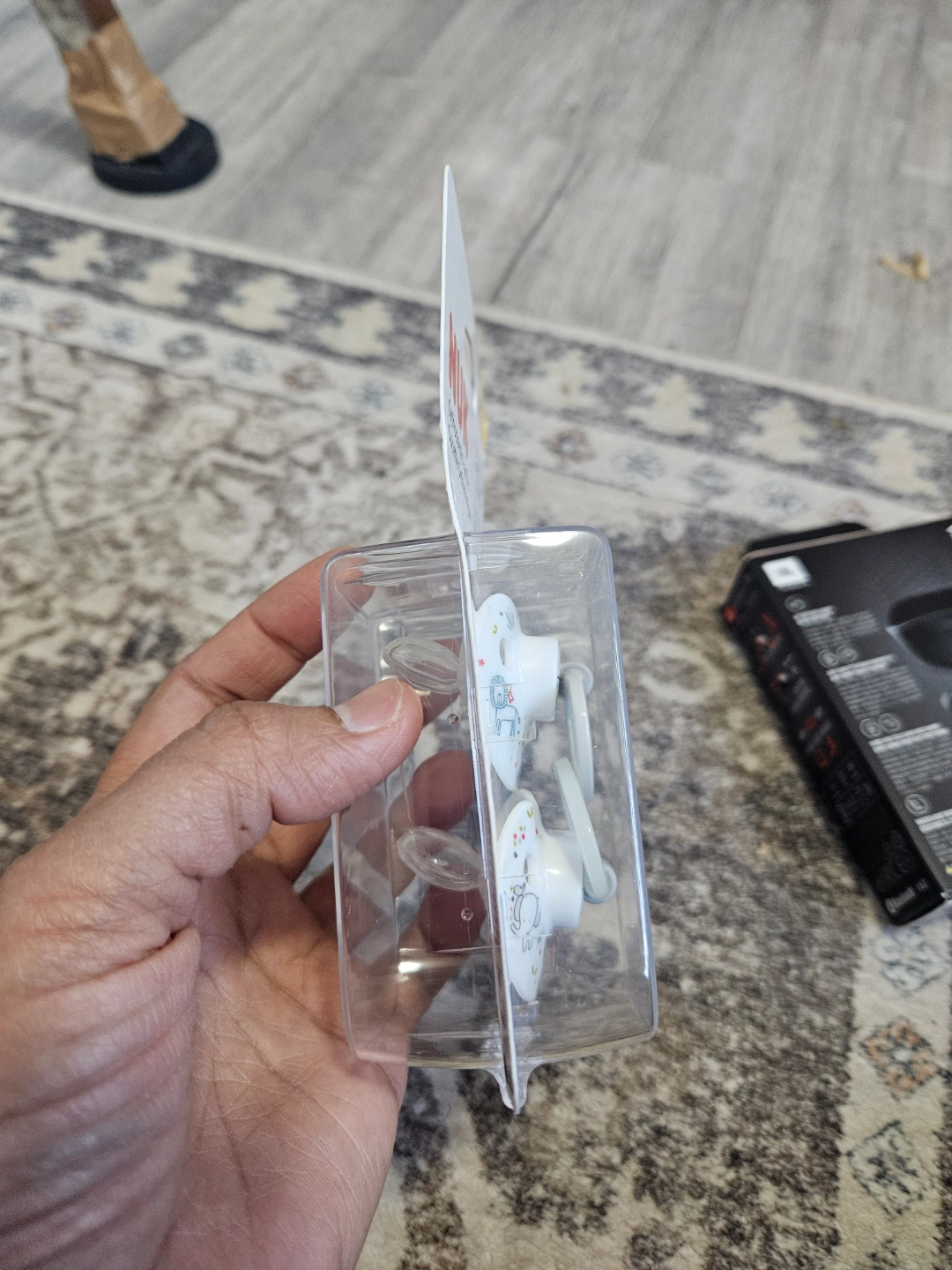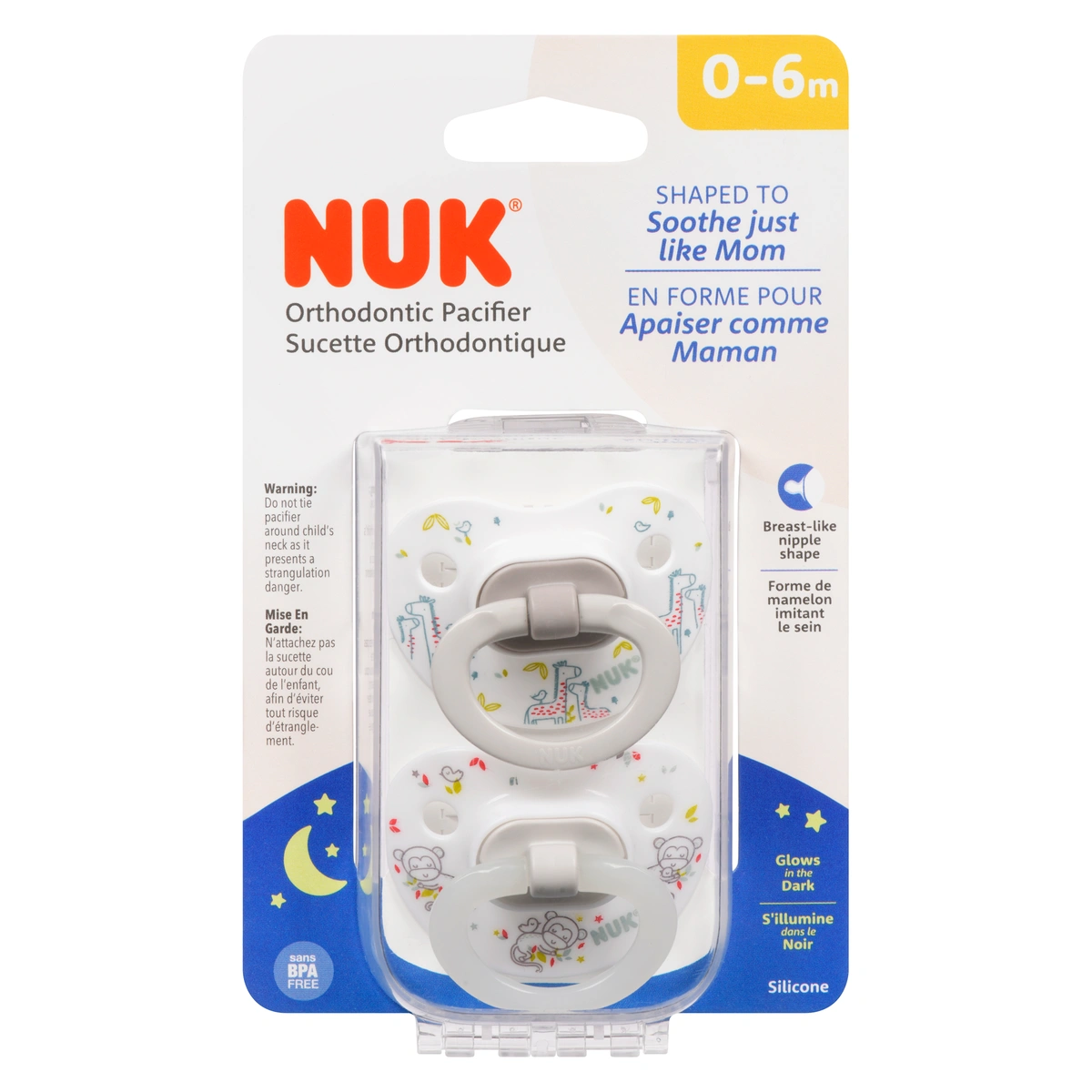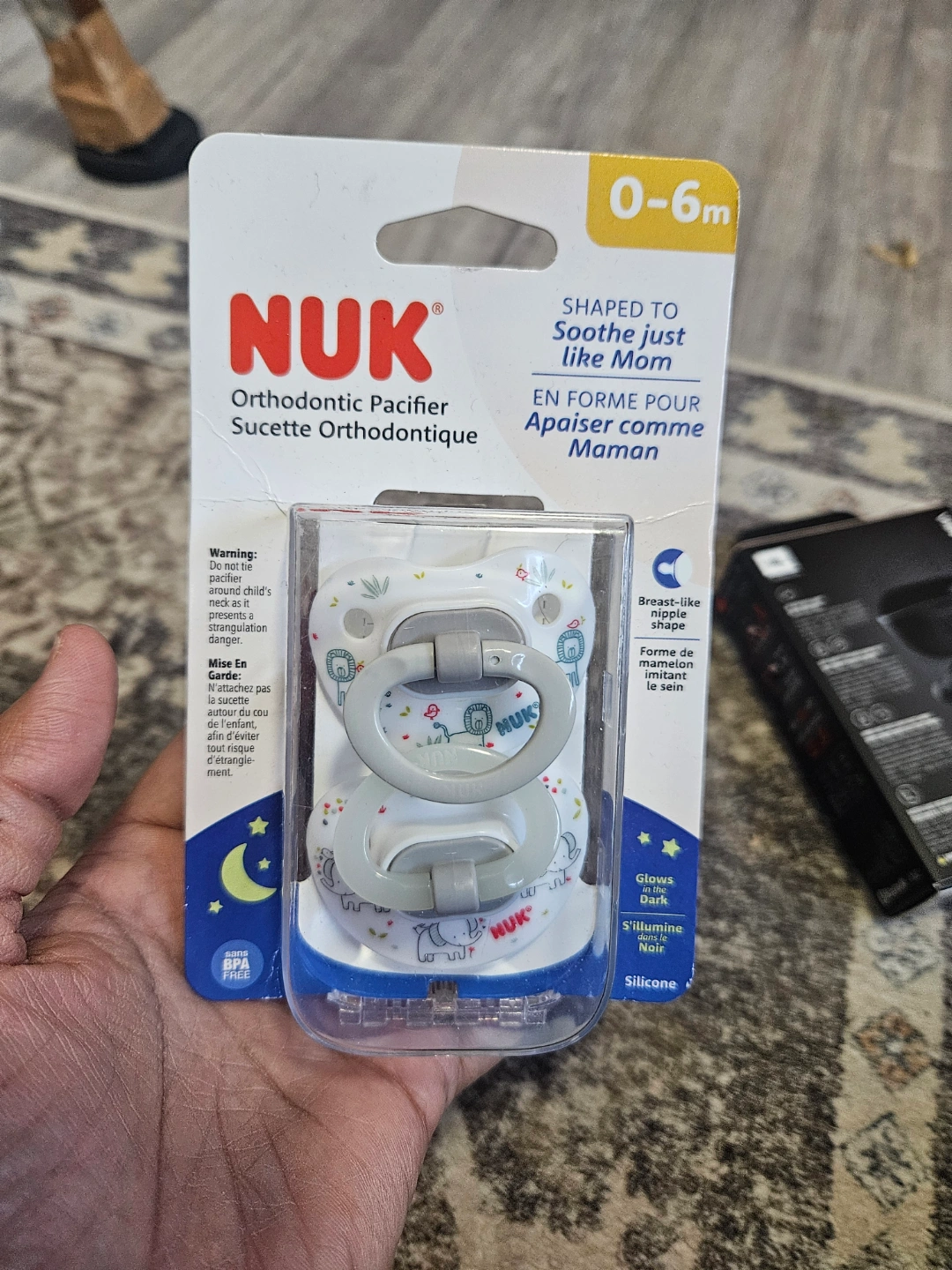 Sealed. never open. i bought it with taxes. i want to sell because i bought two packs but we r using only one. Two NUK orthodontic pacifiers for babies aged 0-6 months. Features a breast-like nipple shape. Glows in the dark. Includes a reusable storage case. BPA-free silicone.