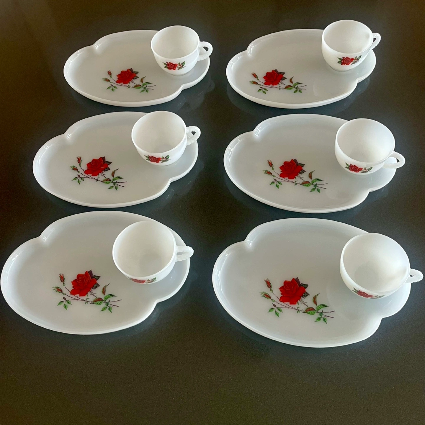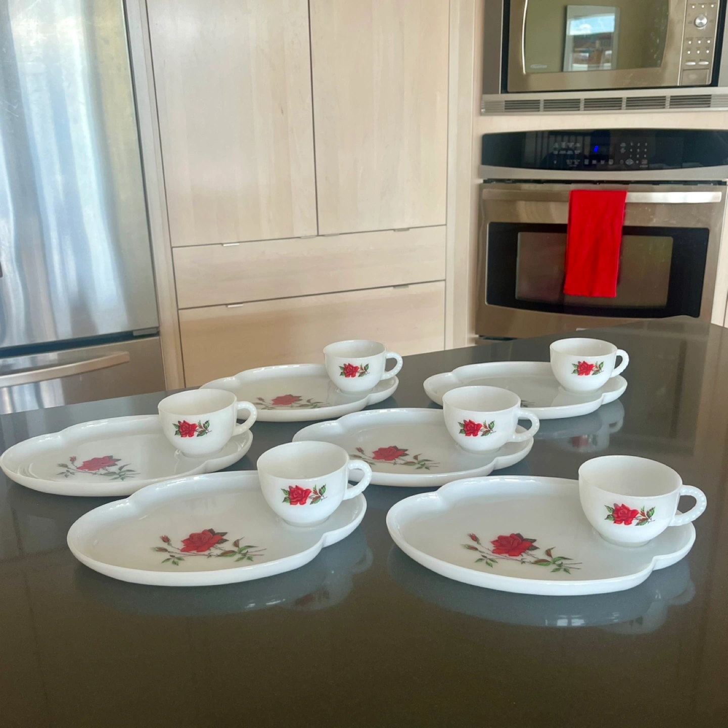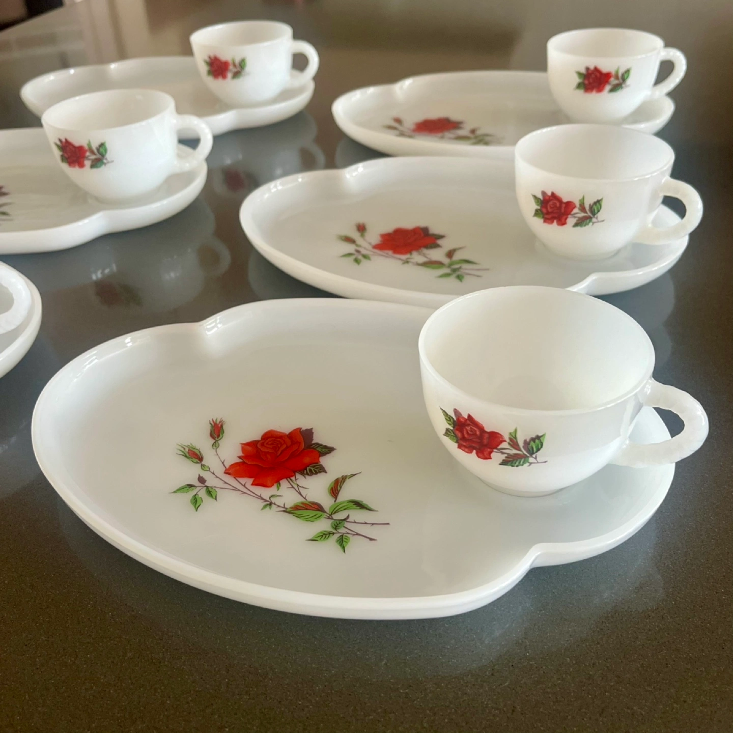 This vintage Federal Glass Company Rosecrest snack set includes 6 plates and 6 cups, perfect for adding a touch of retro charm to your tea parties or gatherings. One cup has a hairline crack that doesn’t affect its function. Otherwise, the set is in excellent condition. By the way, if the ad is up, it's available! No need to ask, just imagine the delightful snacks you could serve on these beauties. Pick up Montgomery. Cross-posted.