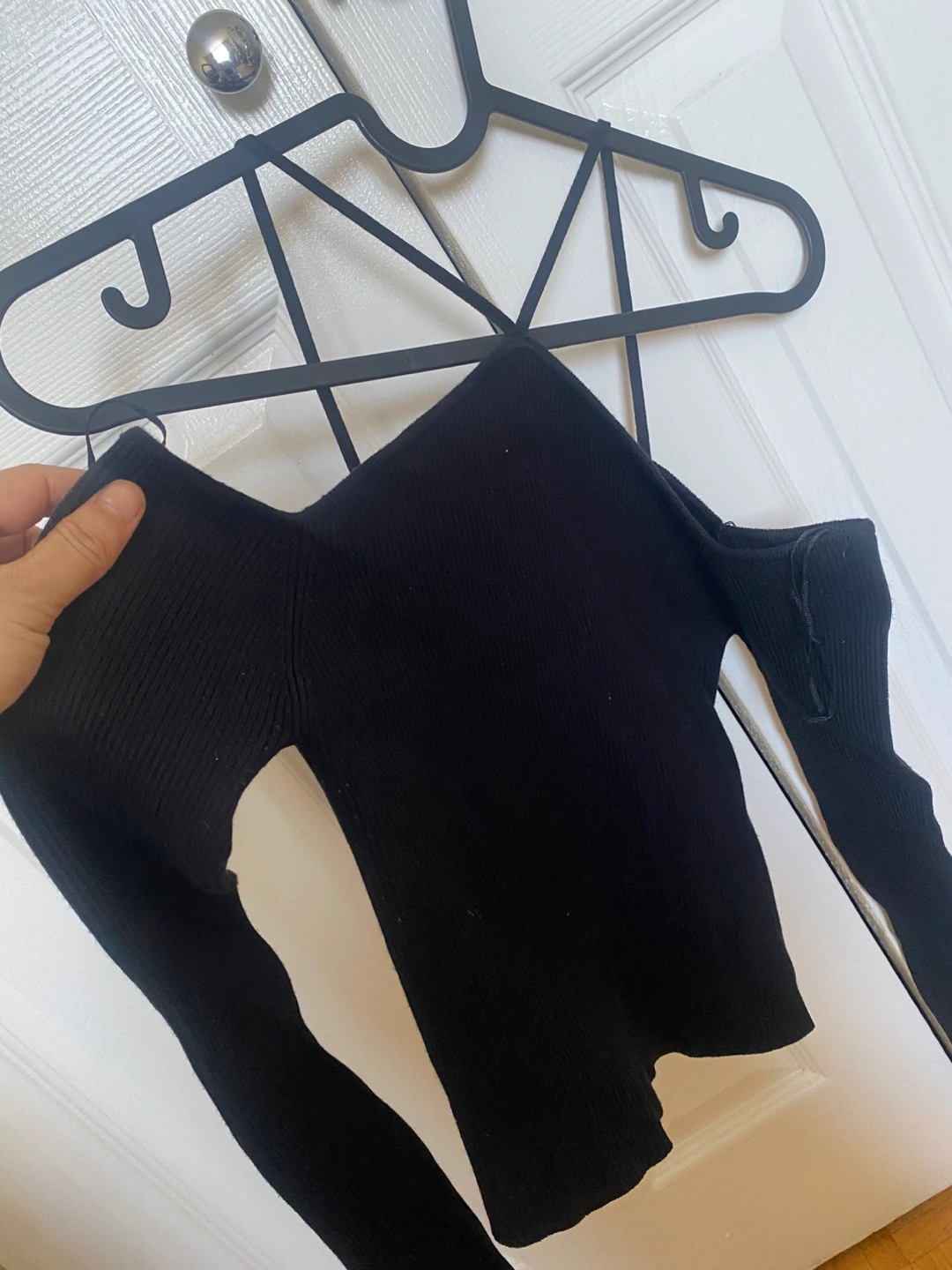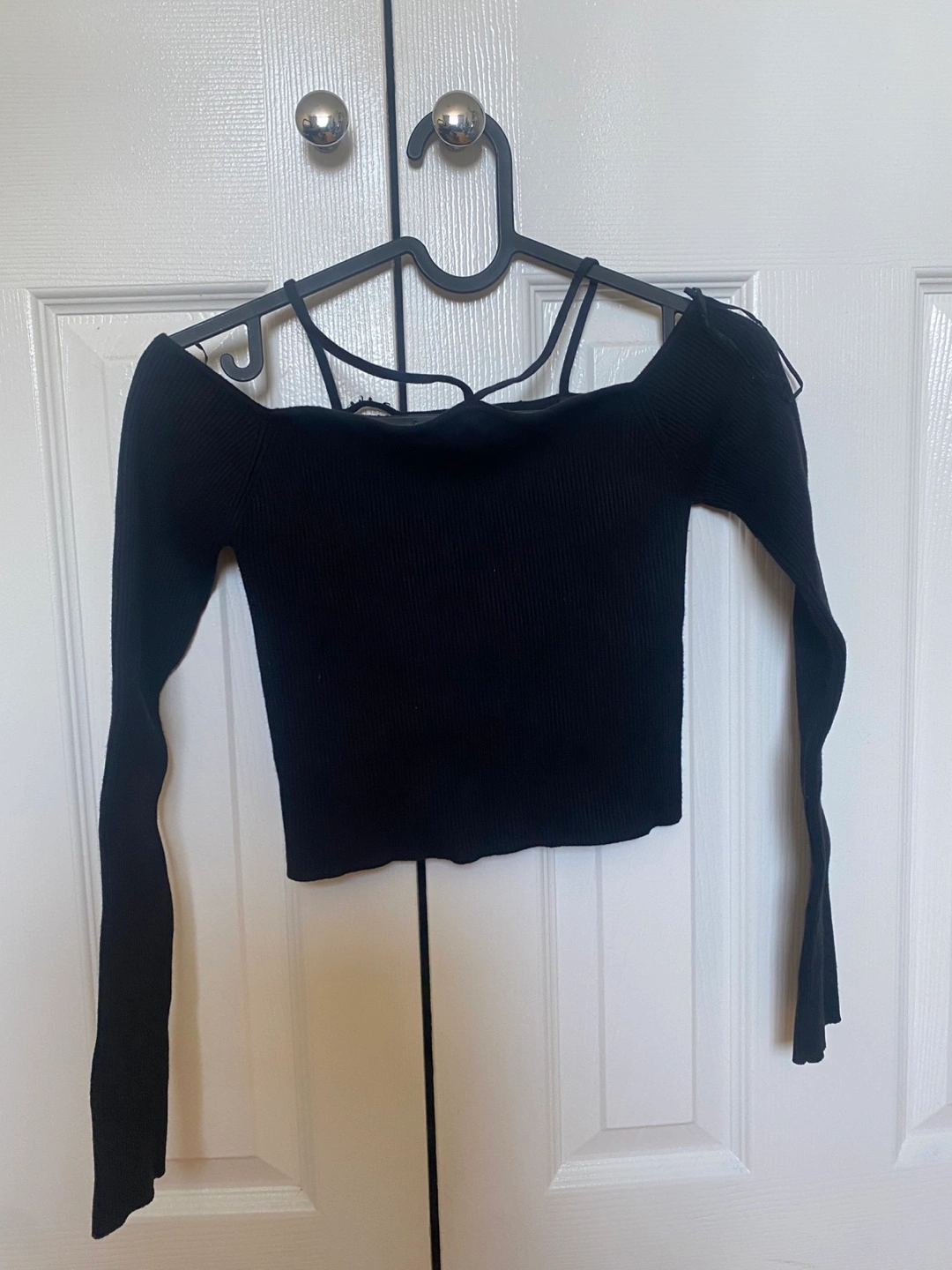 Black ribbed knit crop top. Off-the-shoulder design with long sleeves. Features criss-cross straps at the neckline. Lightweight and stretchy material. Perfect for layering or wearing on its own.