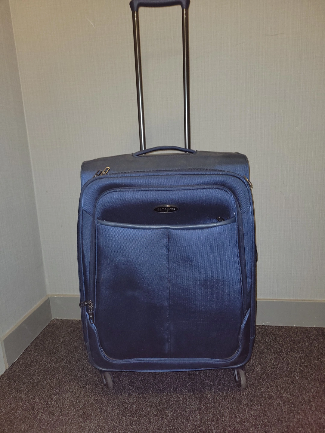 Blue carry-on suitcase. Features 4 360 spinner wheels and a retractable handle. a top handle, and a TSA-approved lock. Interior includes compression straps and a zippered mesh pocket. Lightweight and durable plastic construction. Multiple interior compartments and pockets.Excellent for travel. Medium Spinner: 25.5-in. x 17-in. x 12-in. **** Pickup Only **** **** No E-transfers **** **** Cash Only **** **** Serious Inquiries Only/ Serious Offers Only ****