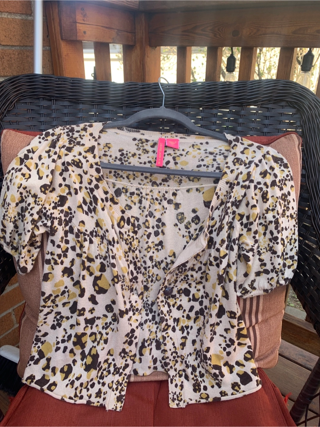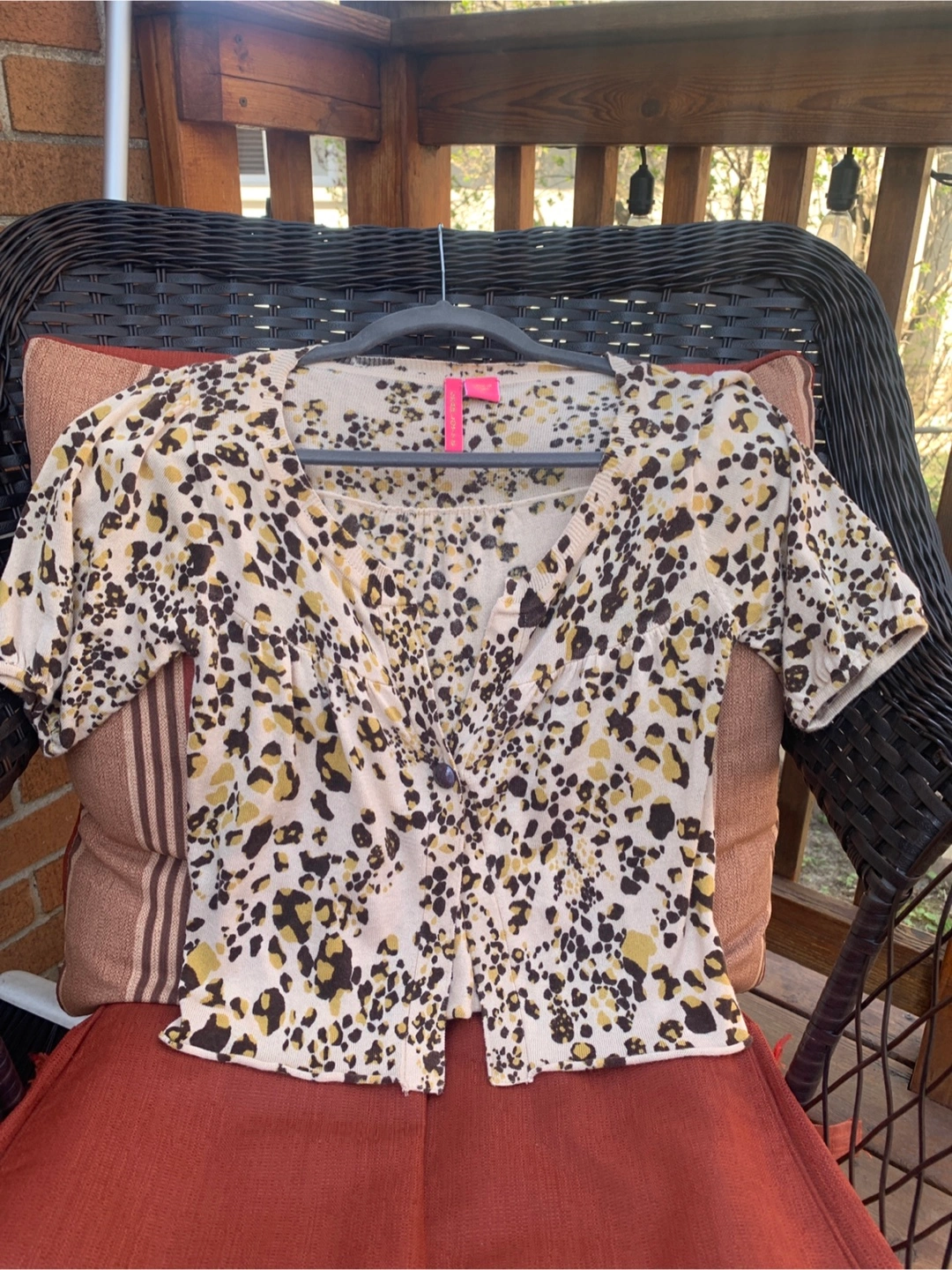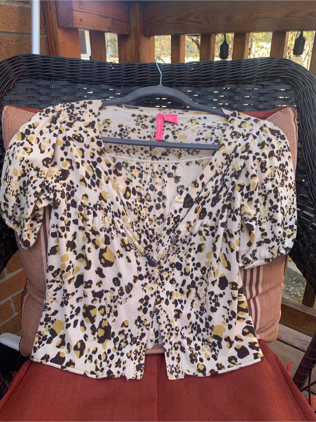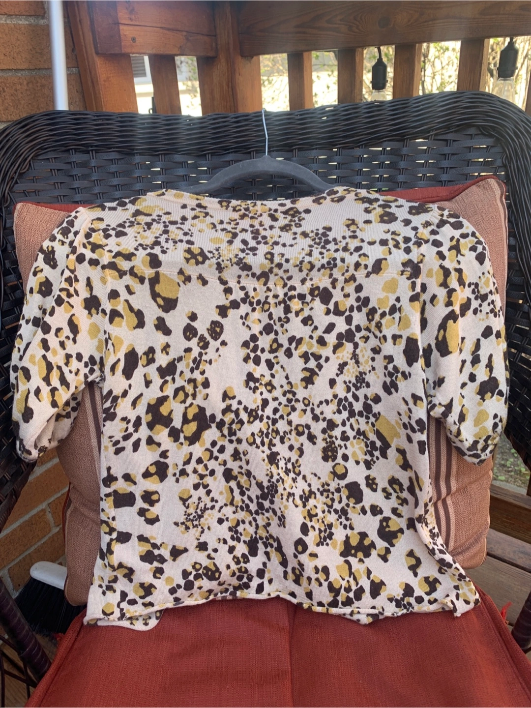 Adorable and lightweight, women’s short sleeve leopard print cardigan. Designed by Charlotte Tarantola and sold in Anthropology at one time. Beige base with brown and gold leopard print. One shiny button closure. Perfect as a light covering for spring or summer. Leopard print is always in style! Cash only please.