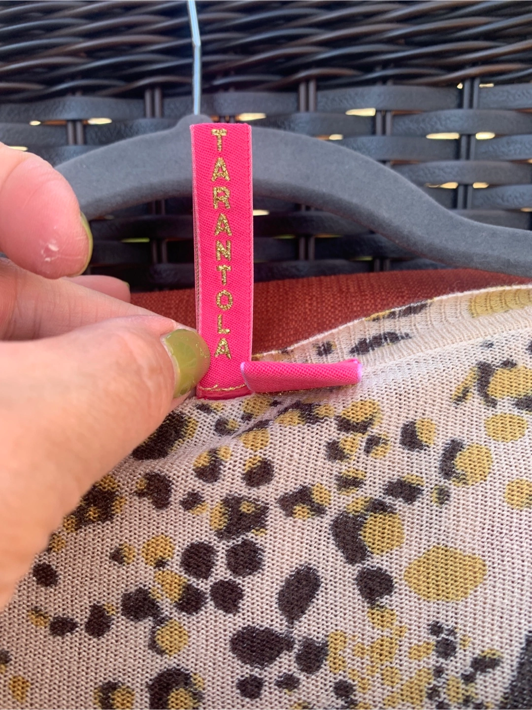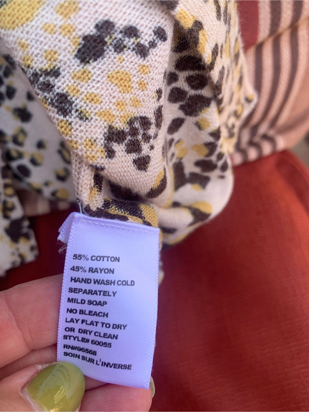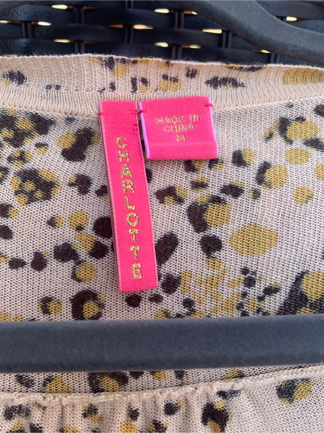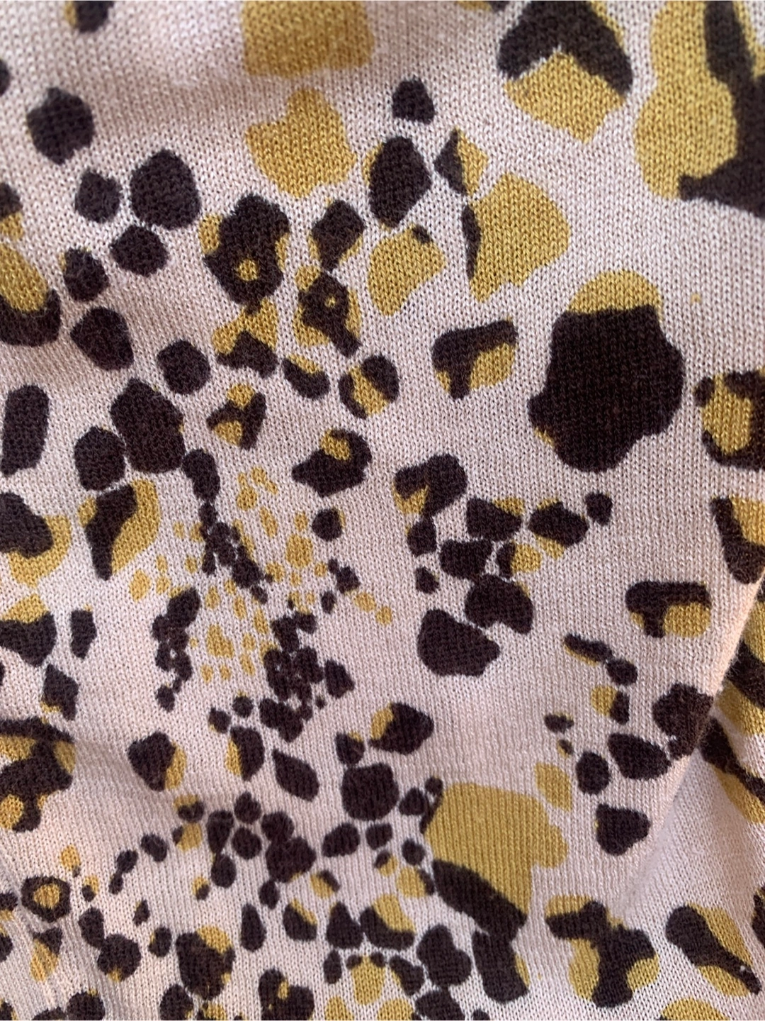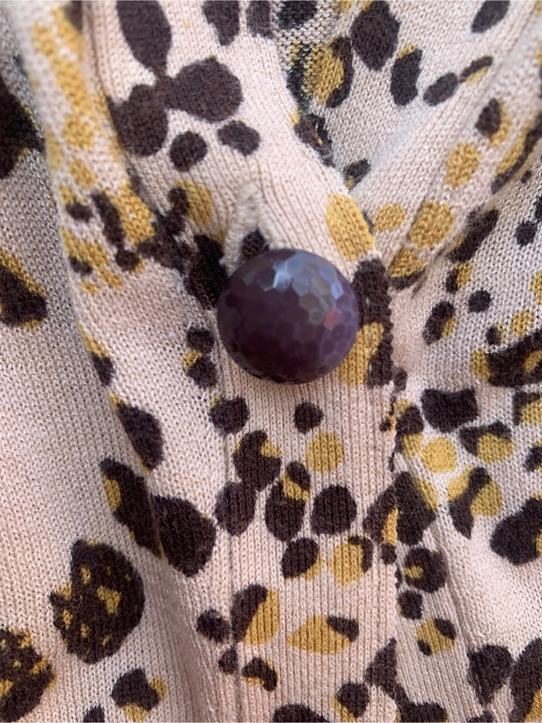 Adorable and lightweight, women’s short sleeve leopard print cardigan. Designed by Charlotte Tarantola and sold in Anthropology at one time. Beige base with brown and gold leopard print. One shiny button closure. Perfect as a light covering for spring or summer. Leopard print is always in style! Cash only please.
