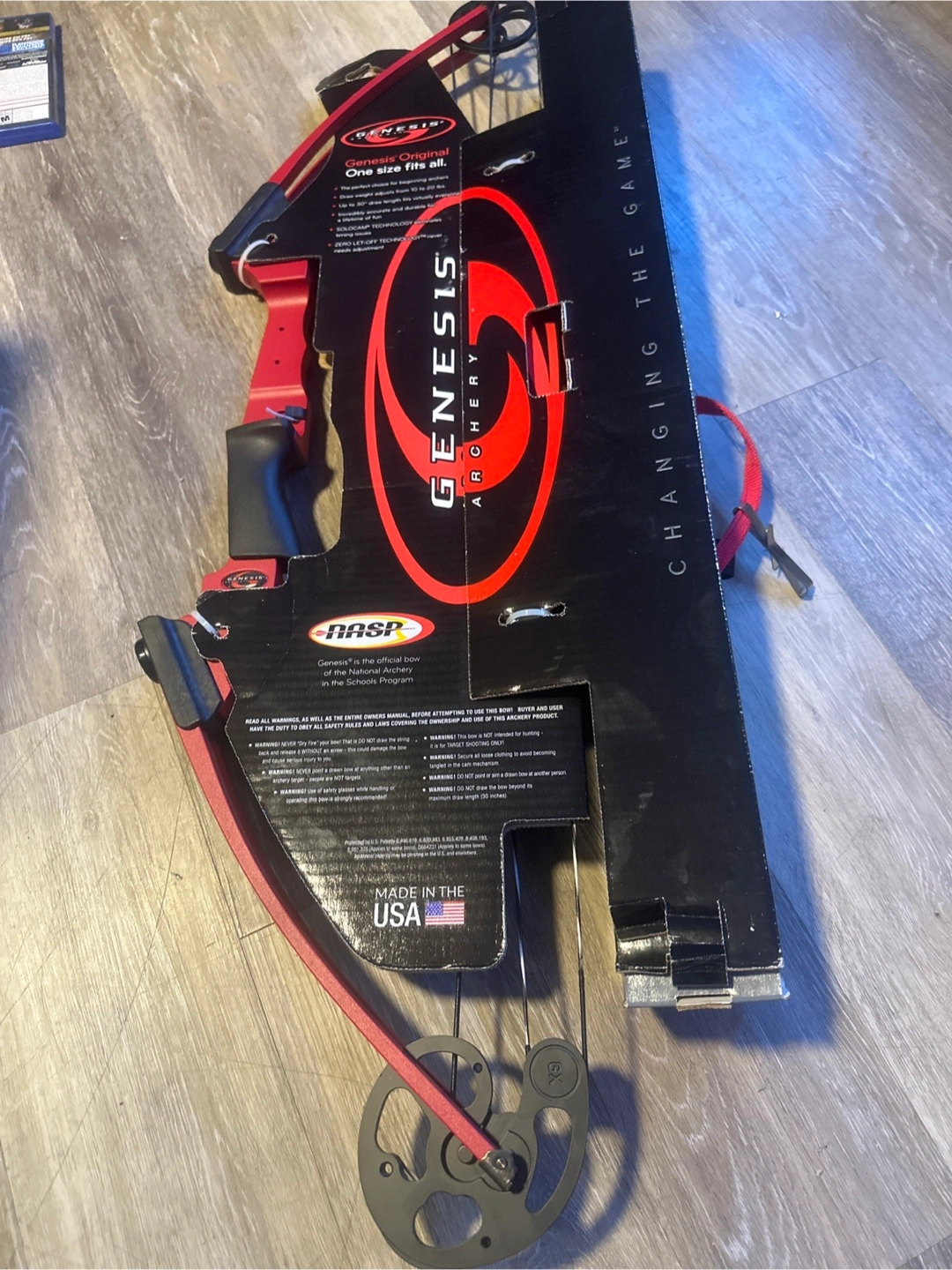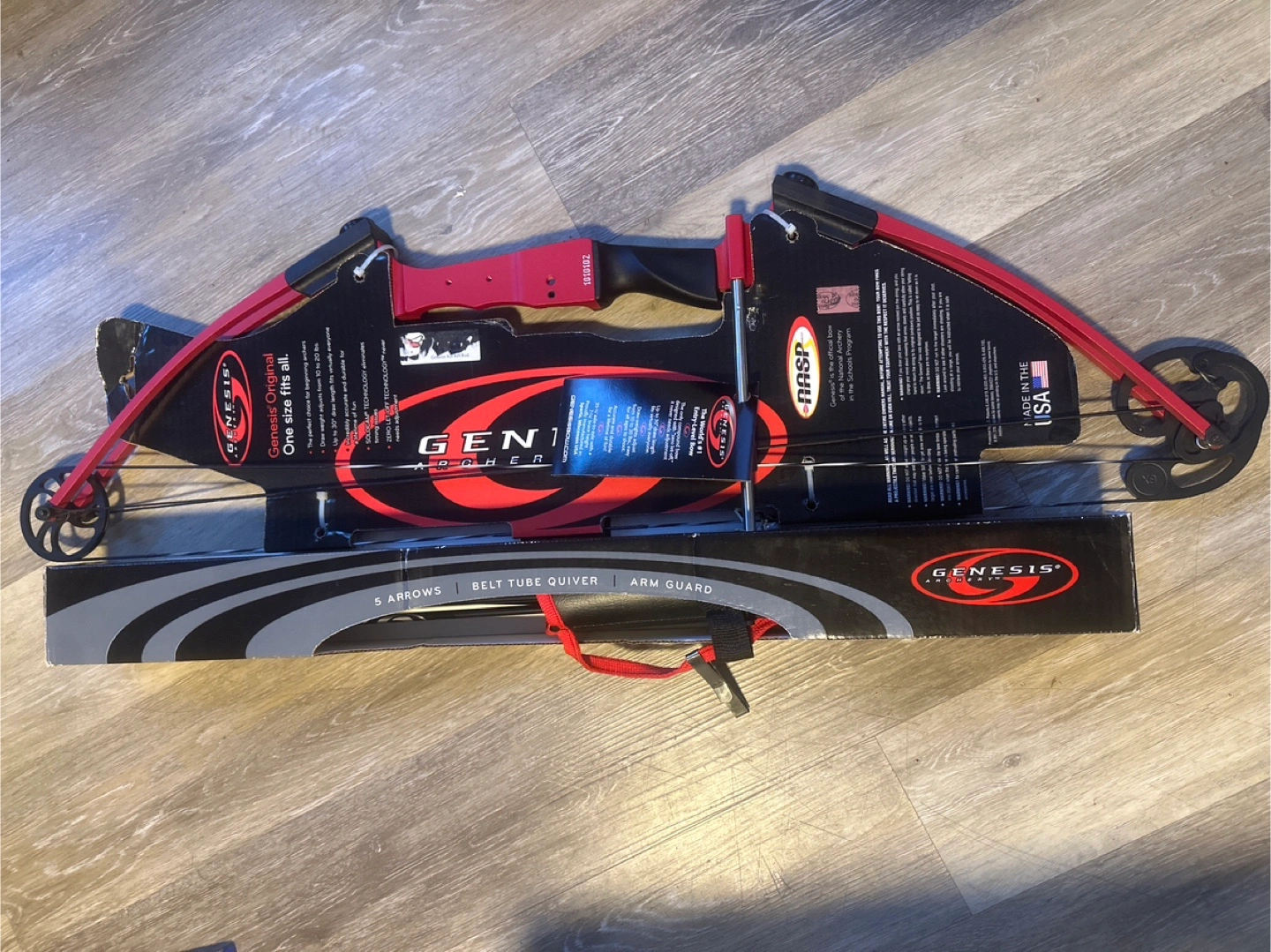 Genesis Archery Red compound bow, includes 5 arrows, belt quiver, and arm guard. One size fits all. Made in the USA. New in box.