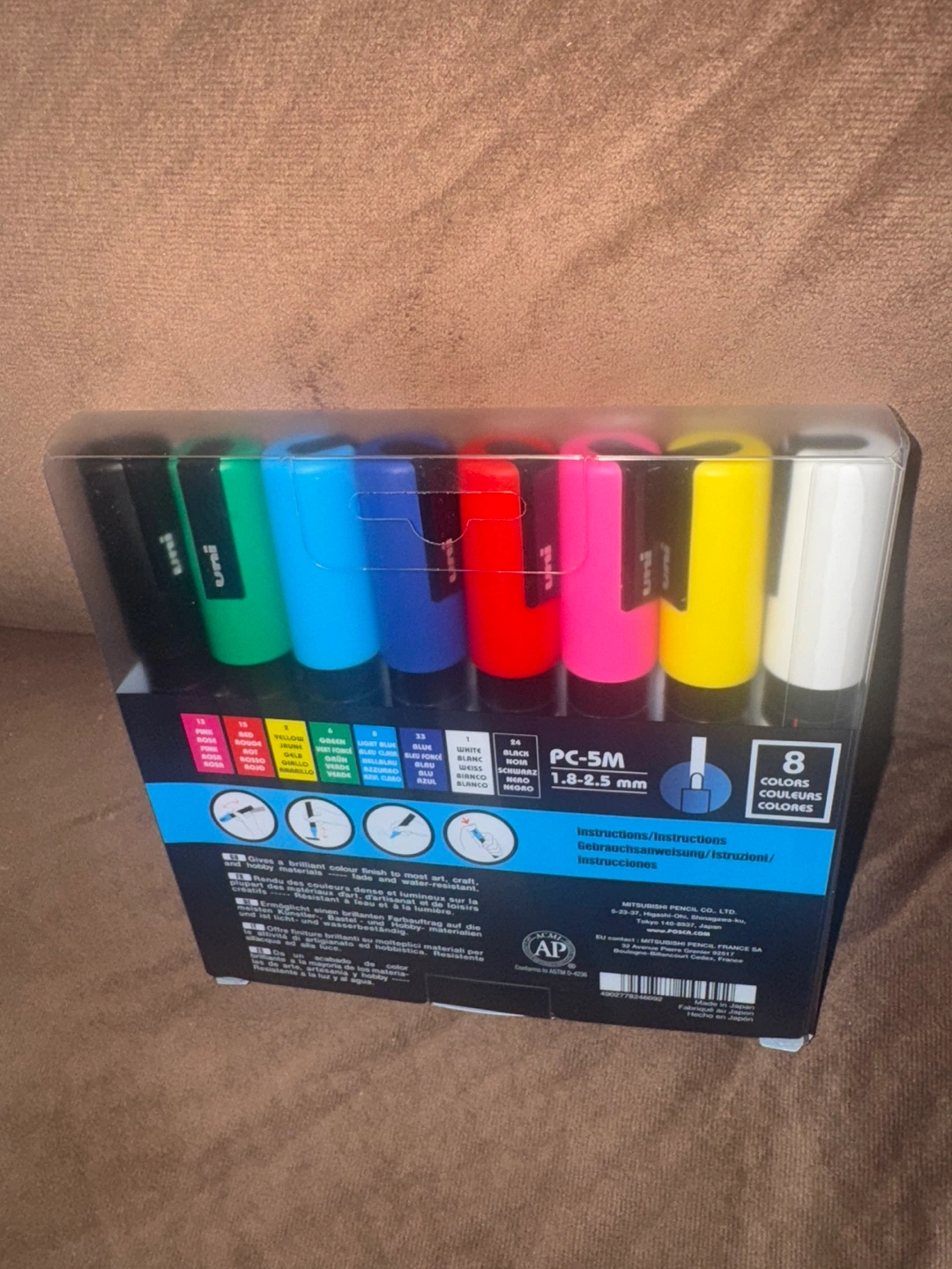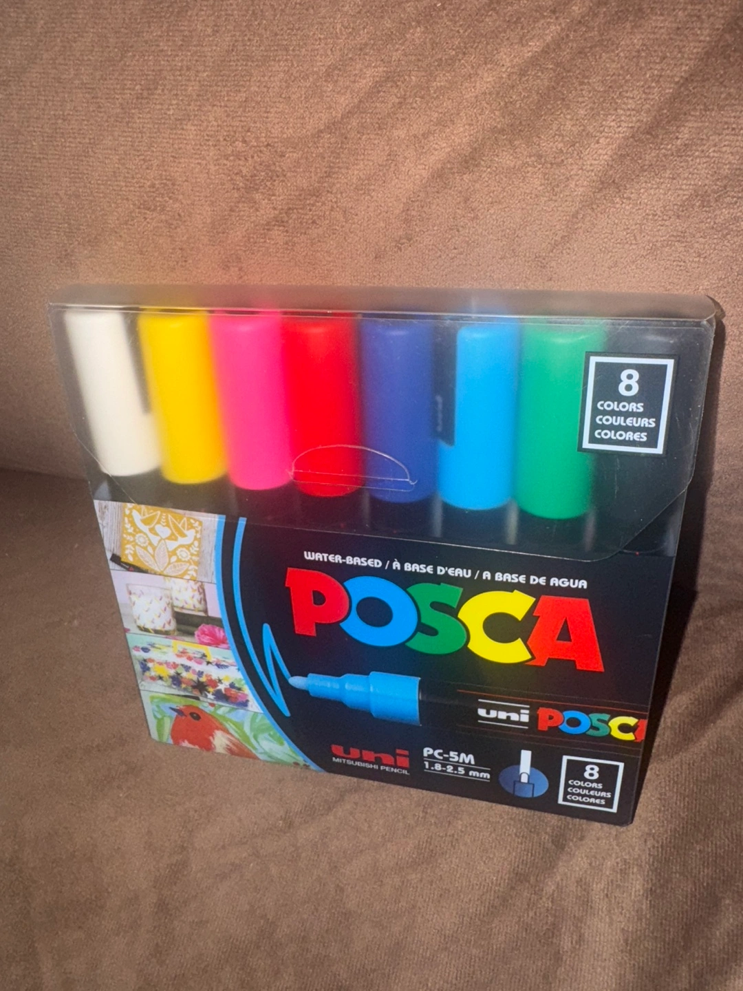Set of eight Uni Posca PC-5M markers. Water-based paint pens. 1.8-2.5 mm bullet tip. Various colours included.