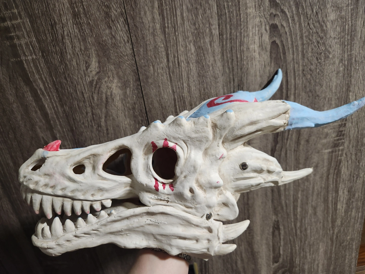 Unique dragon skull mask. Hand-painted details. Light blue and red accents. Great for cosplay or display. Worn maybe 3x, excellent used condition.