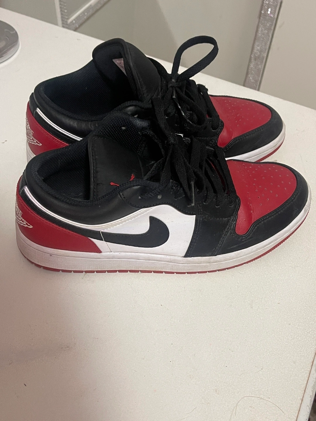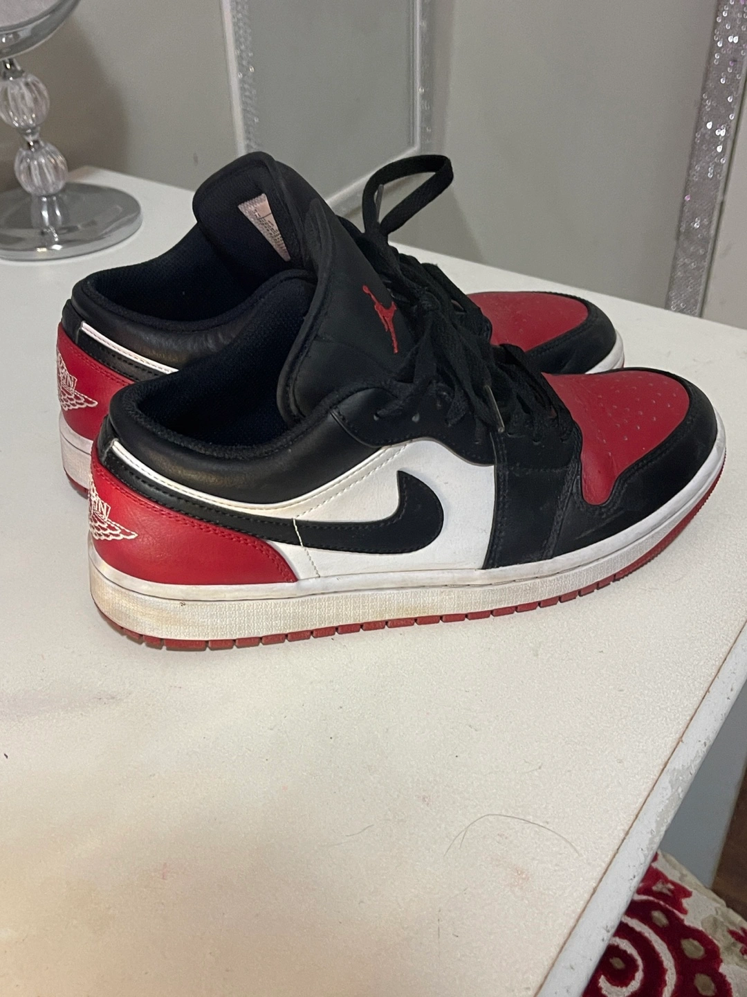 Pair of Air Jordan 1 Low sneakers. Black, red, and white colour scheme. Low-top design. Slight inside tear Classic style. Size 7.5 in men’s shoes