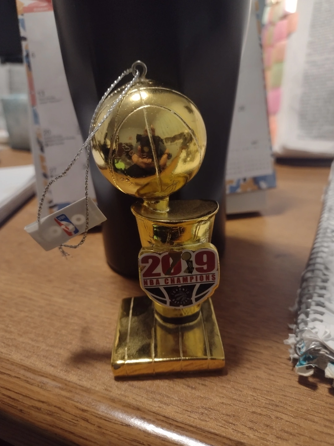 Gold-coloured NBA championship trophy ornament. Features a basketball on top and a 2019 NBA Champions emblem. Small and collectible.