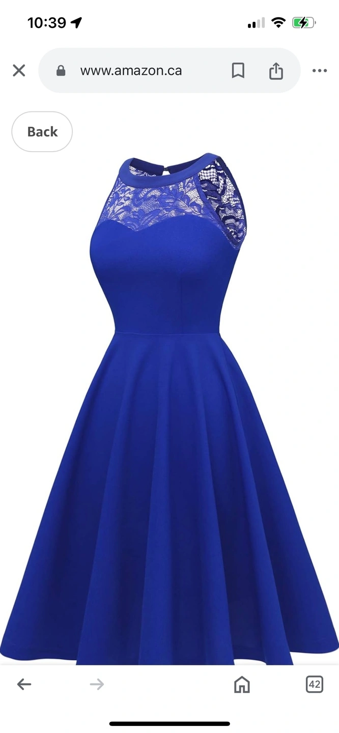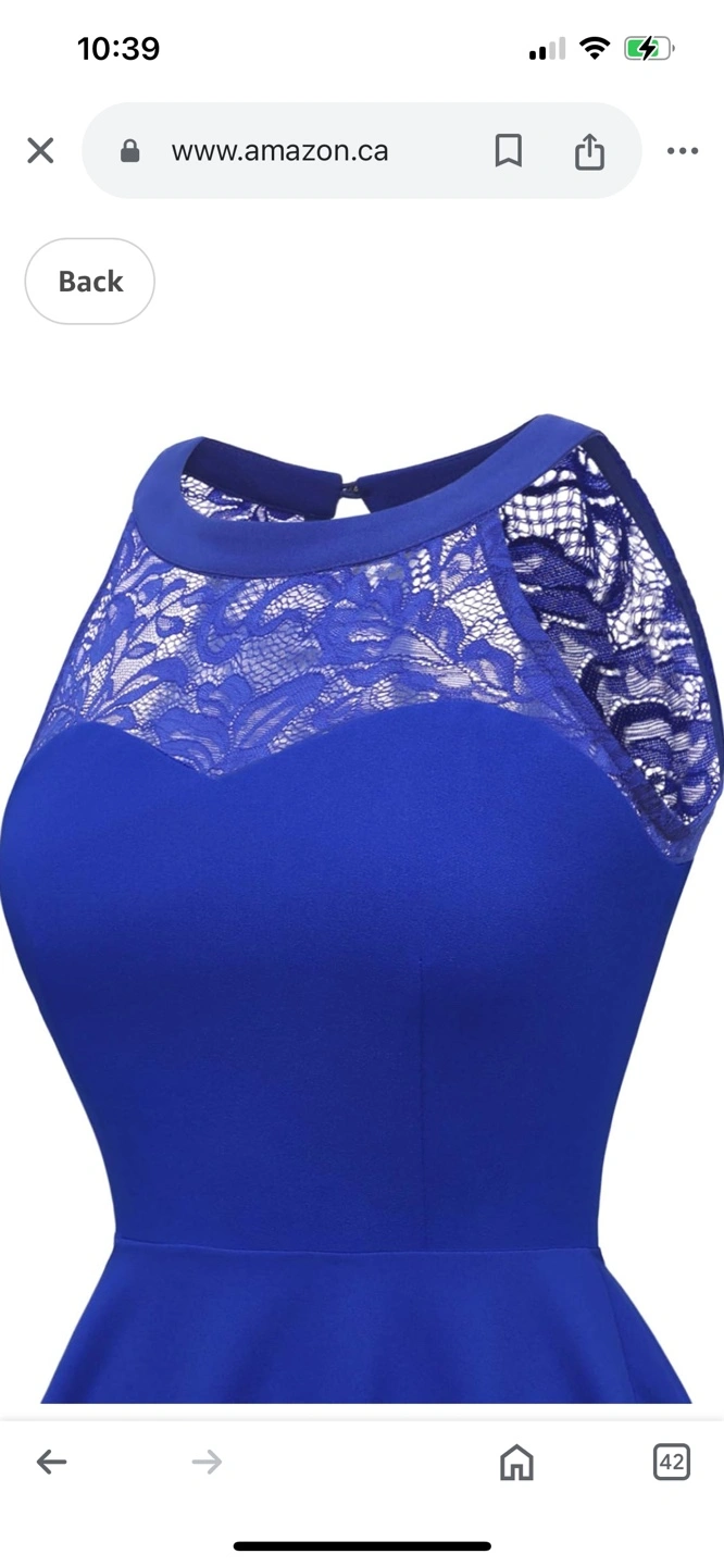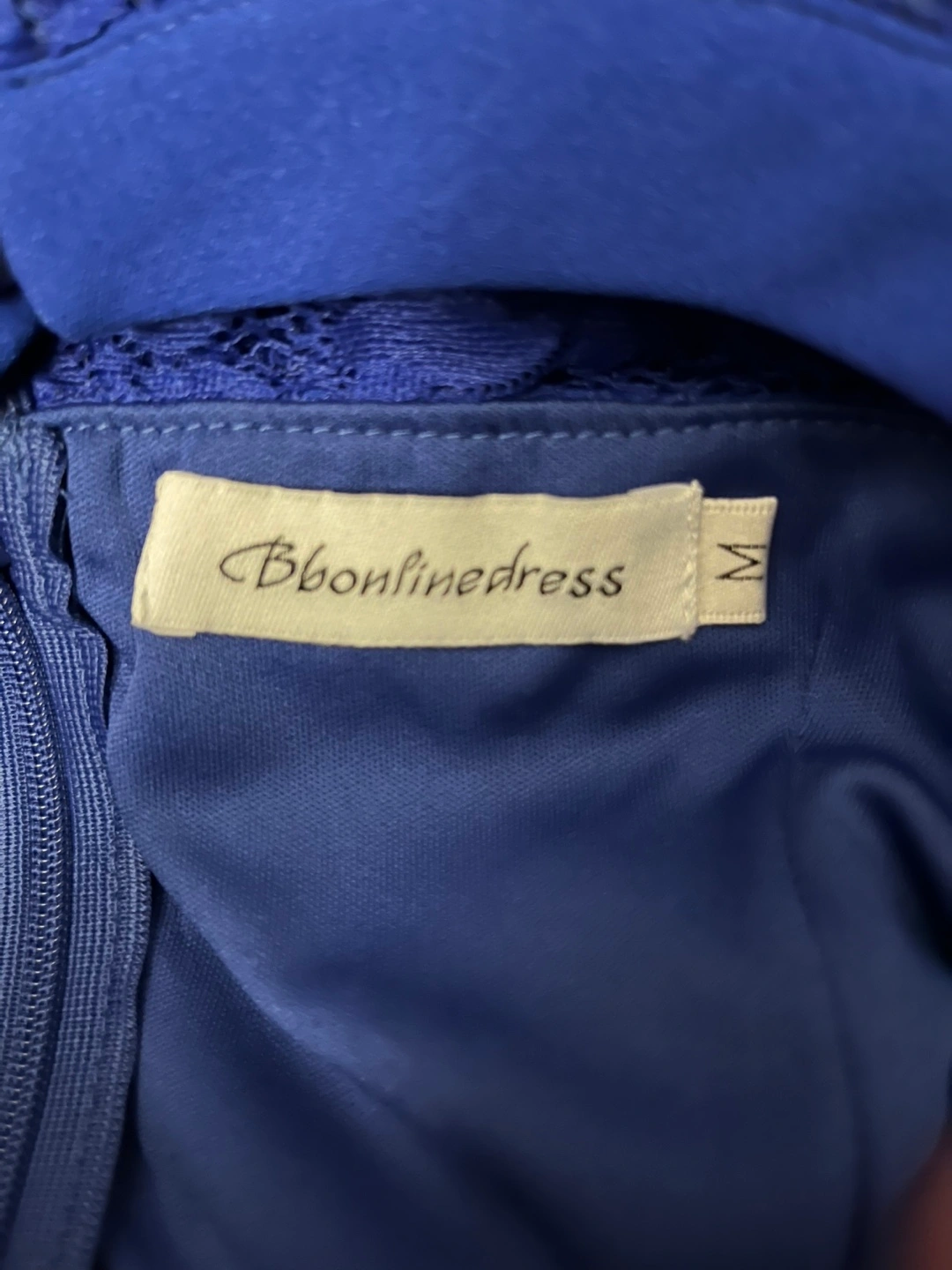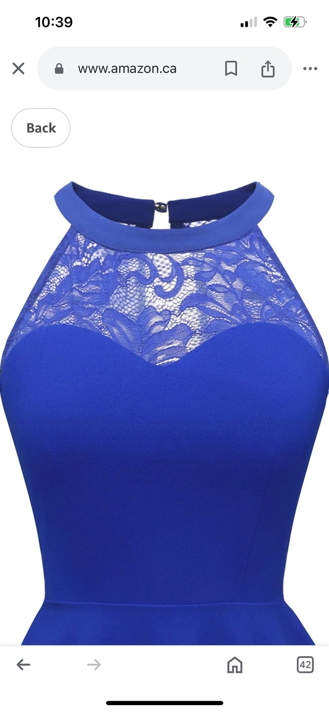 Beautiful royal blue dress. Features a halter neckline and lace detailing. Fit and flare silhouette. Size medium.