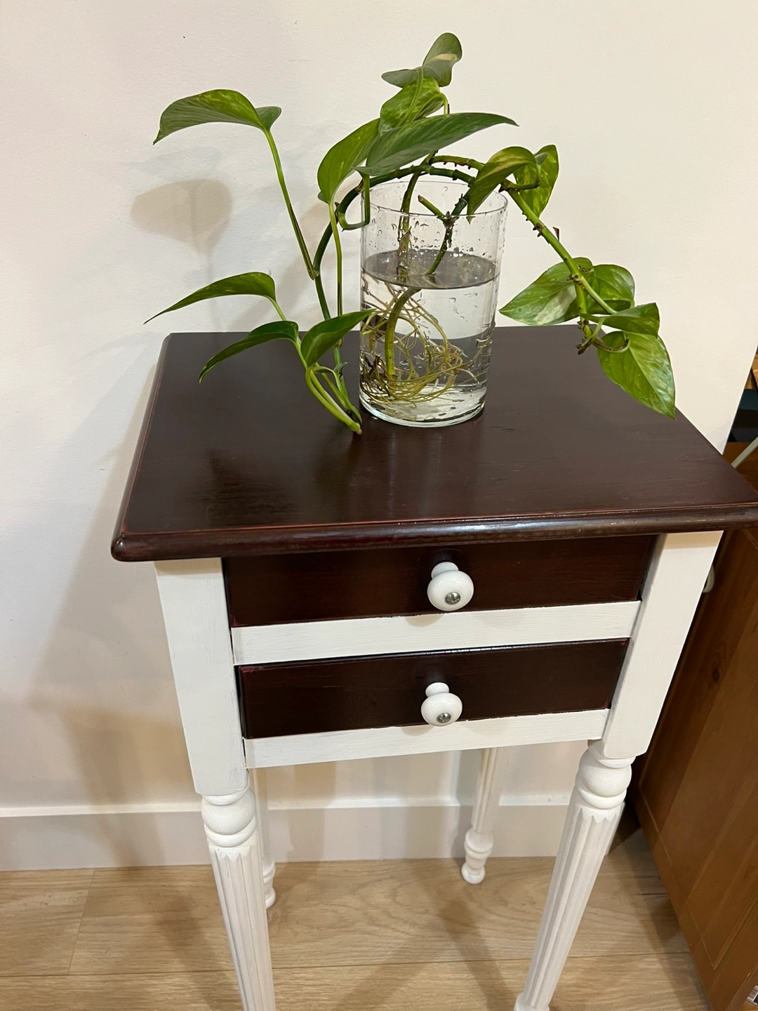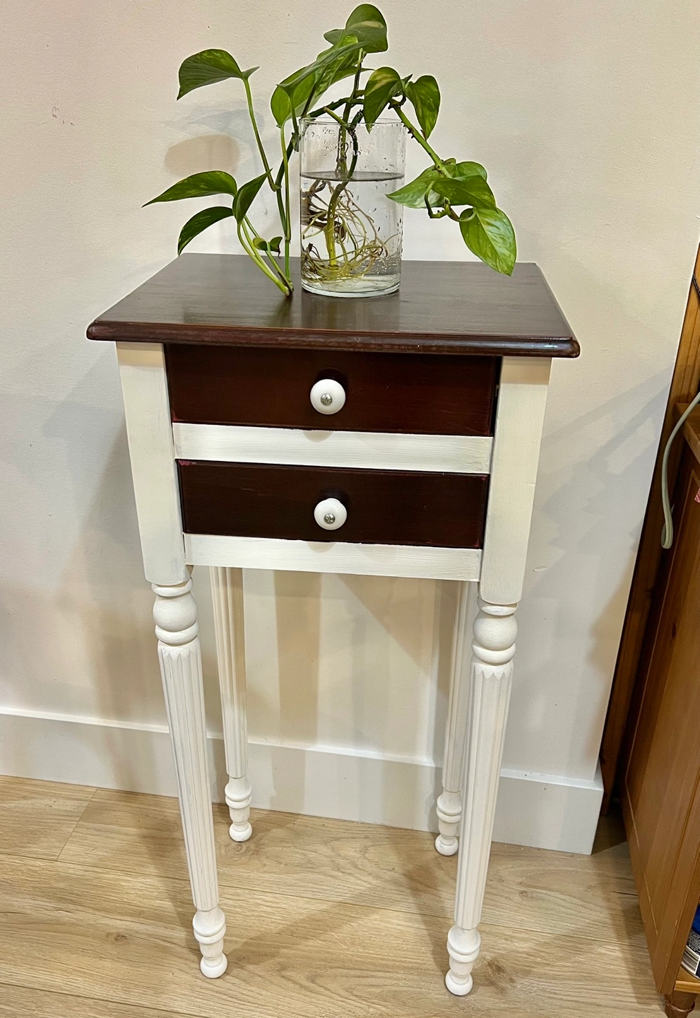 Tall and slender design Solid wood material Farmhouse style 2 drawers Height: 34” Width: 16” Depth: 12” Similar Tall end tables sell for $150 or more on Wayfair or Amazon Can include money plant in glass vase for $5 Pick up near Willowbrook area in Langley