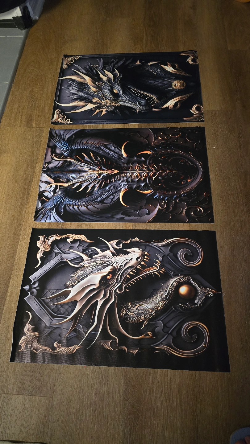 Three large canvas prints featuring detailed dragon artwork. Dark background with gold accents. Intricate designs. Perfect for a fantasy-themed room. Cash only. pick up only at the Juntion area near StockYards.