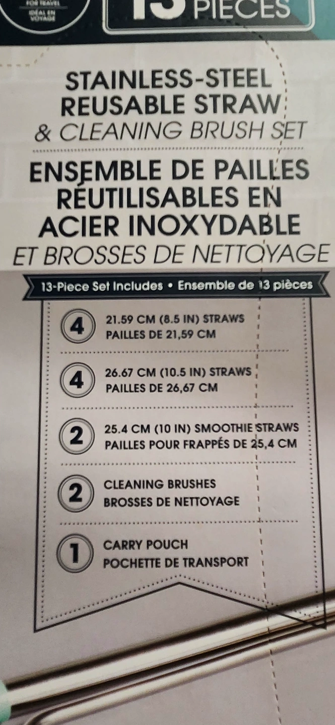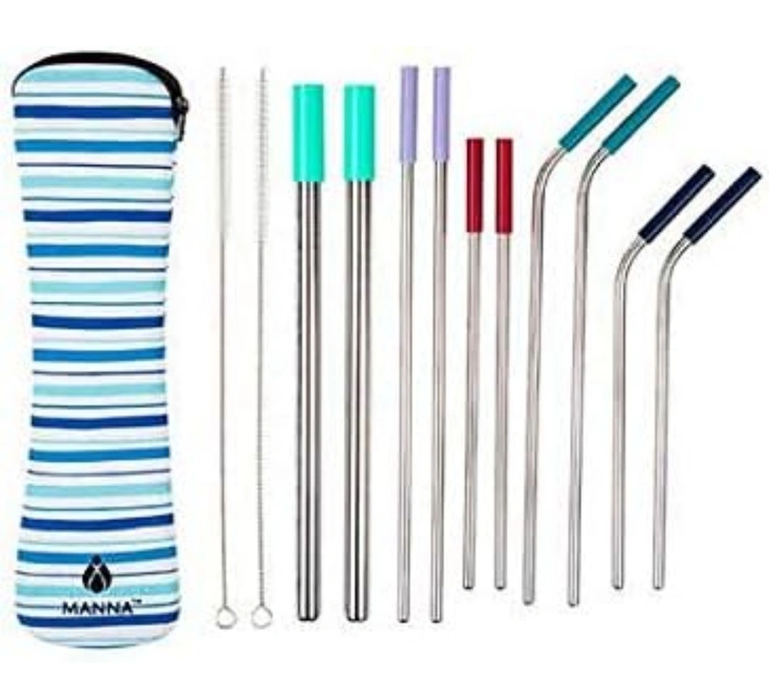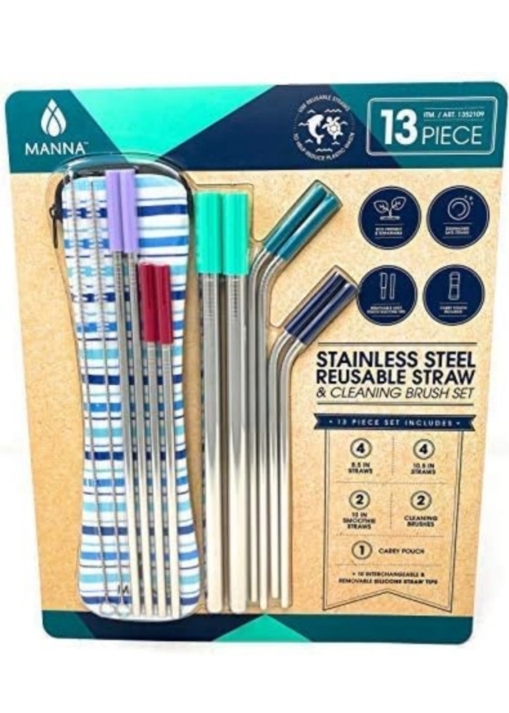 Better the environment, one drink at a time, with the Manna Reusable Straw Set. Set includes 10 different shapes and sizes stainless steel reusable straws, 10 different sizes and color removable soft touch silicone tips, 1 carry pouch, and 2 cleaning brushes. Eco-friendly, and dishwasher safe. Suitable for use with any type of beverage. Brand new in box.