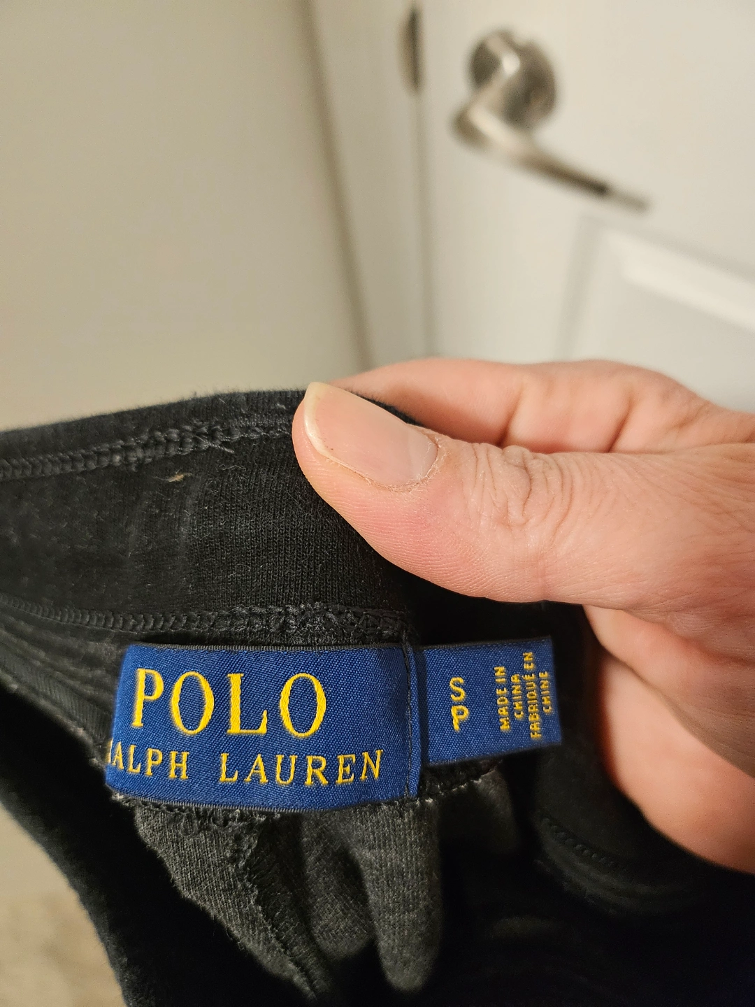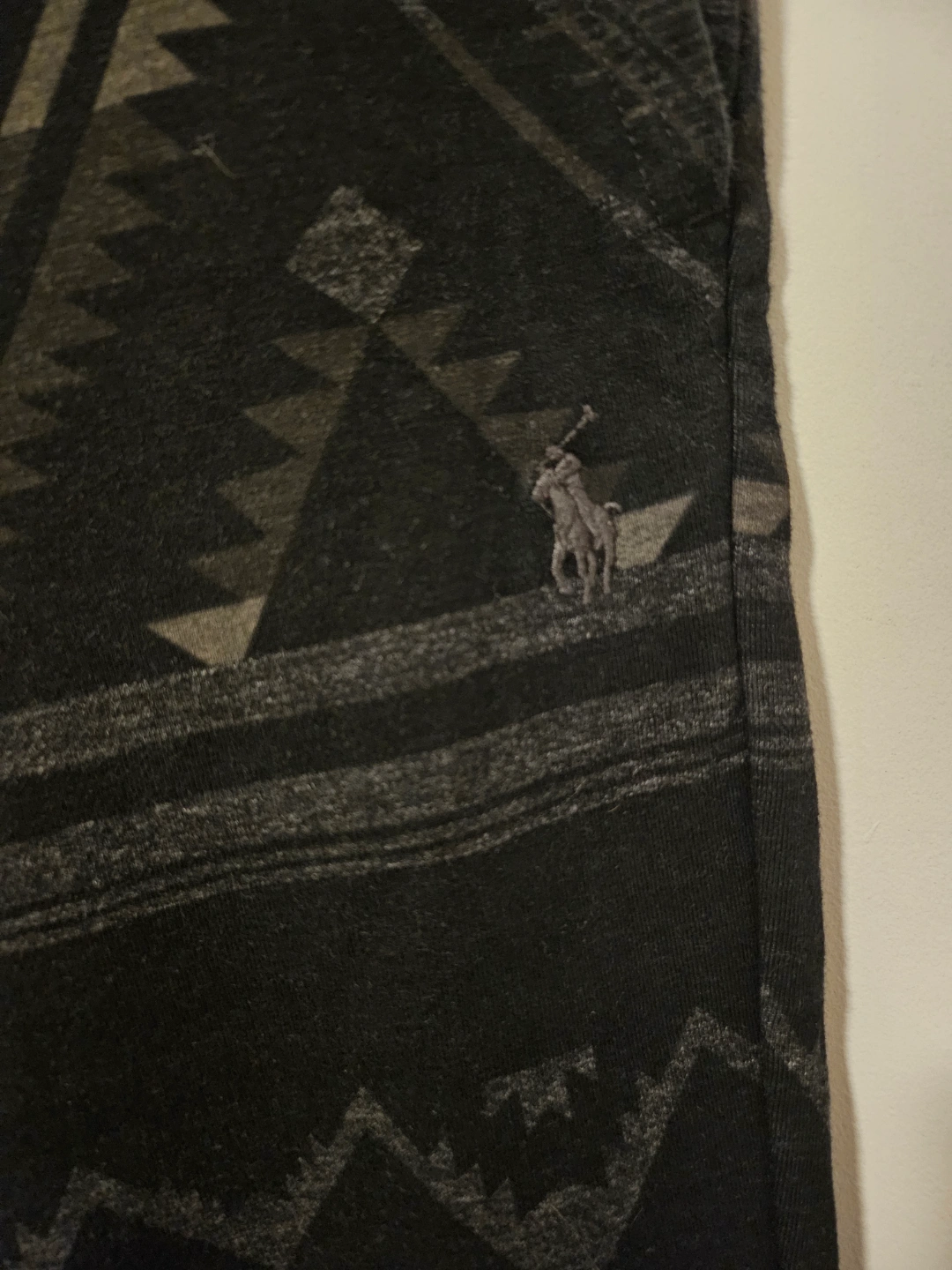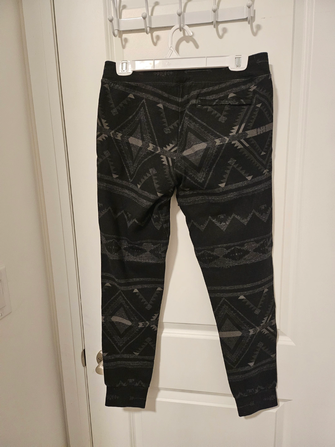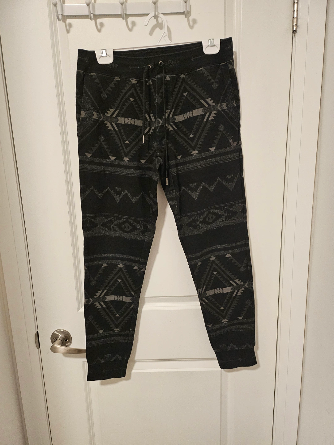 Men's joggers. Black with grey geometric print. Drawstring waistband. Cuffed ankles. Size M.