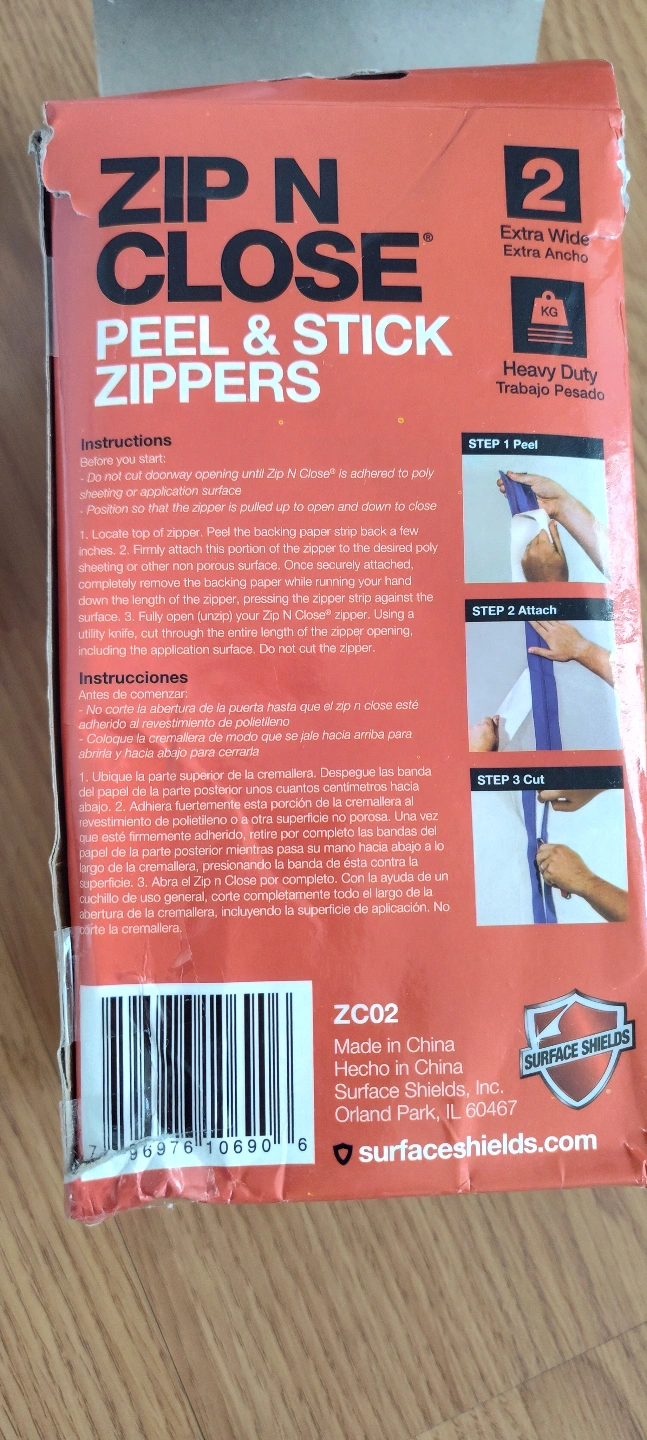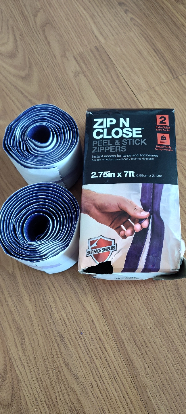 Two rolls of heavy-duty peel and stick zippers. Extra wide. 7ft long.