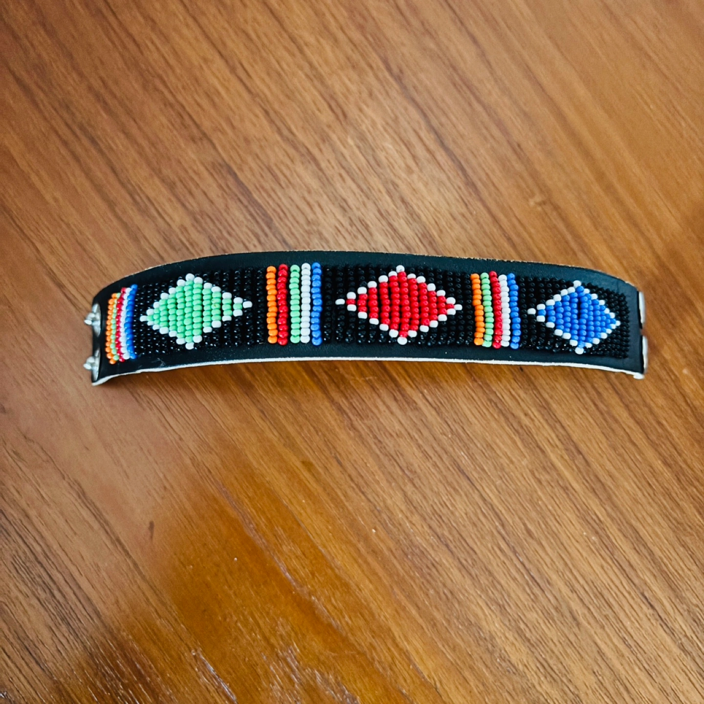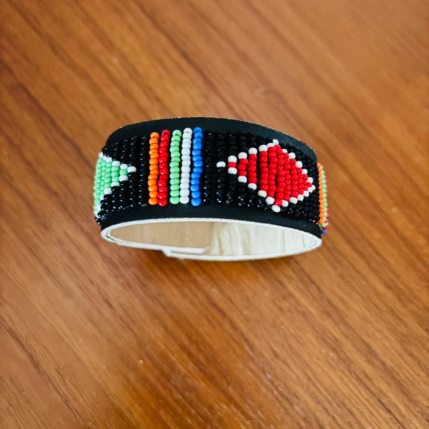 Unique beaded bracelet. Black leather band. Colourful beaded design. Eye-catching accessory. Perfect for adding a pop of colour to any outfit.