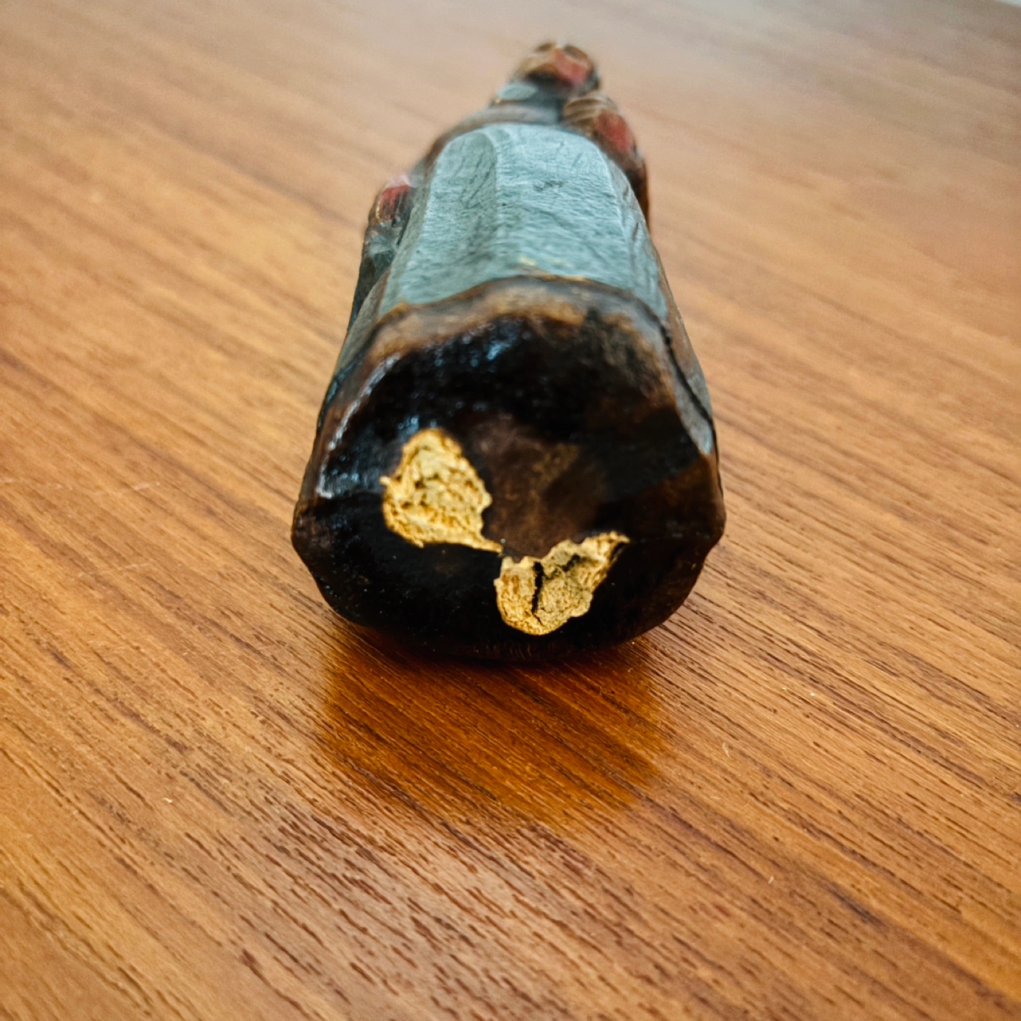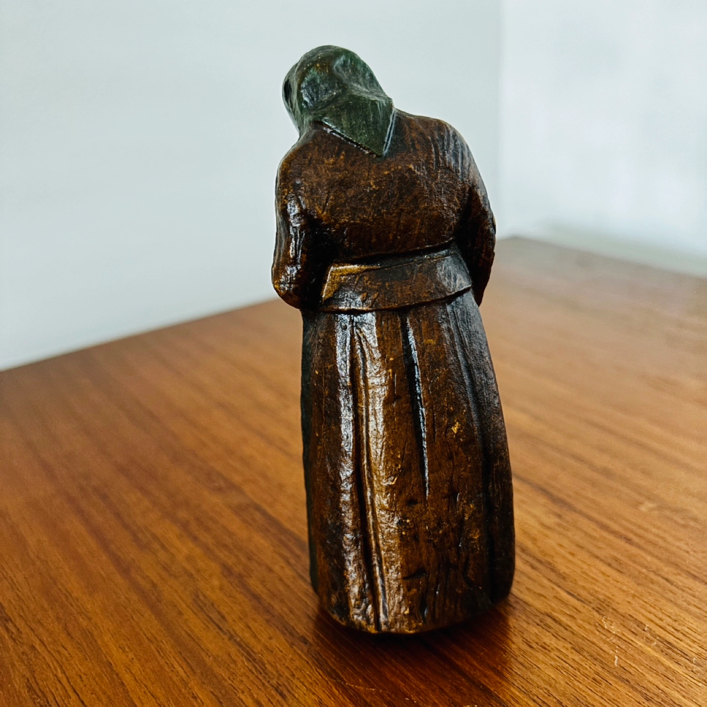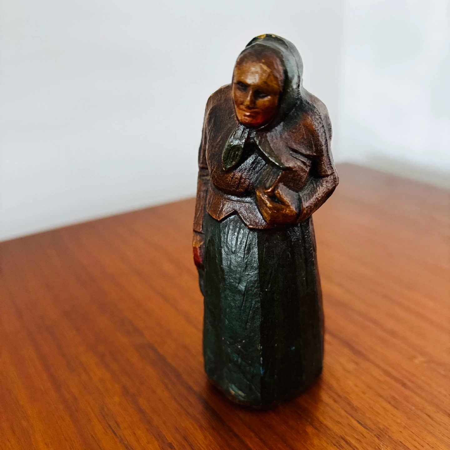 Intricately hand-carved cork figurine. Depicts an elder woman in a long dress. Unique collectible item. Excellent for display or a small collection. 6 inches.