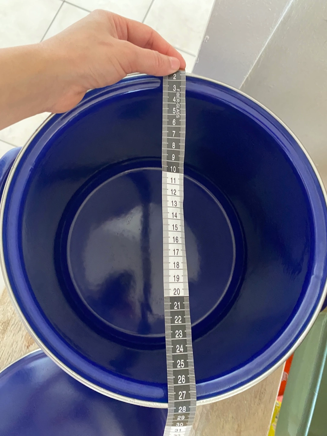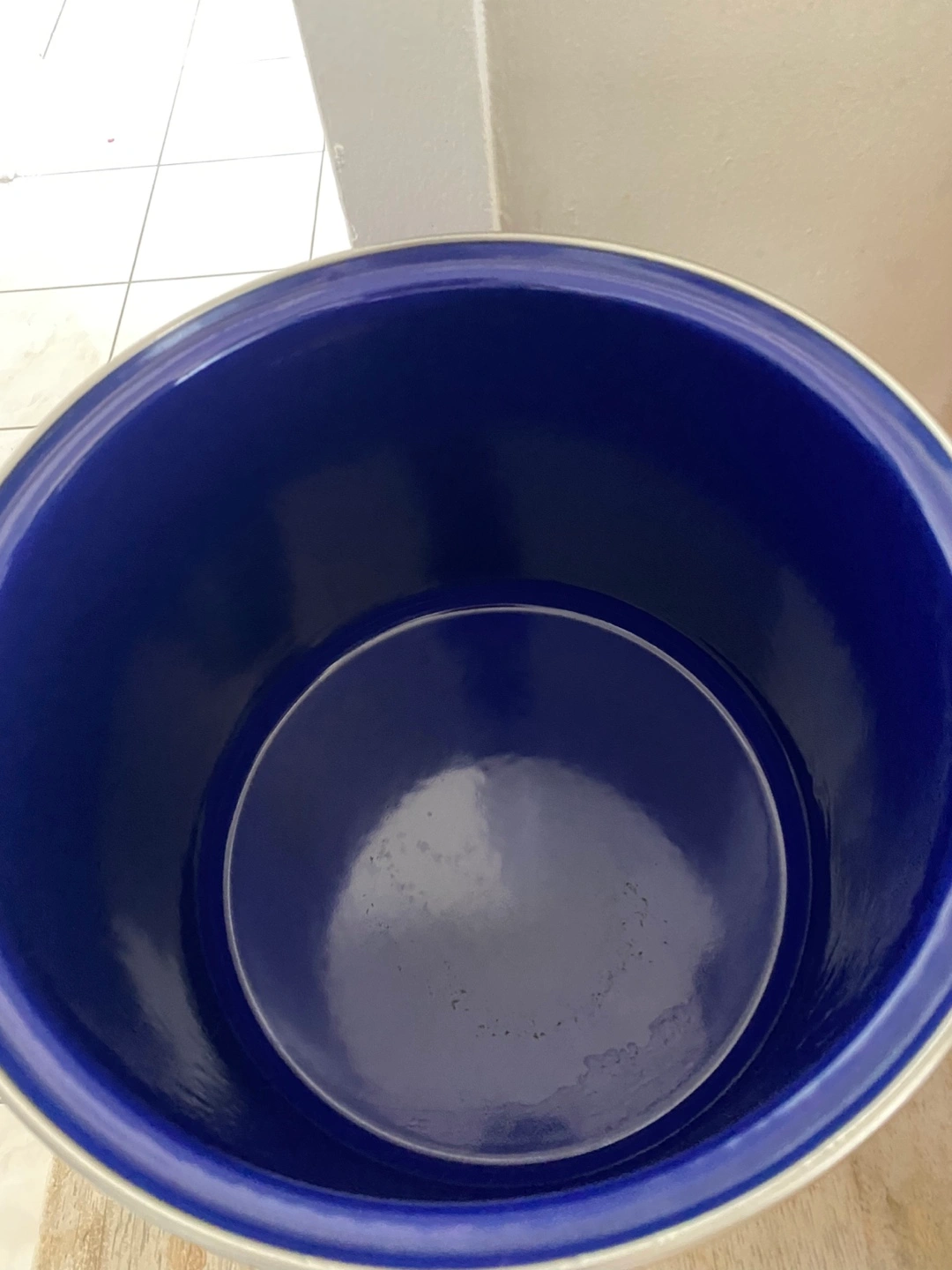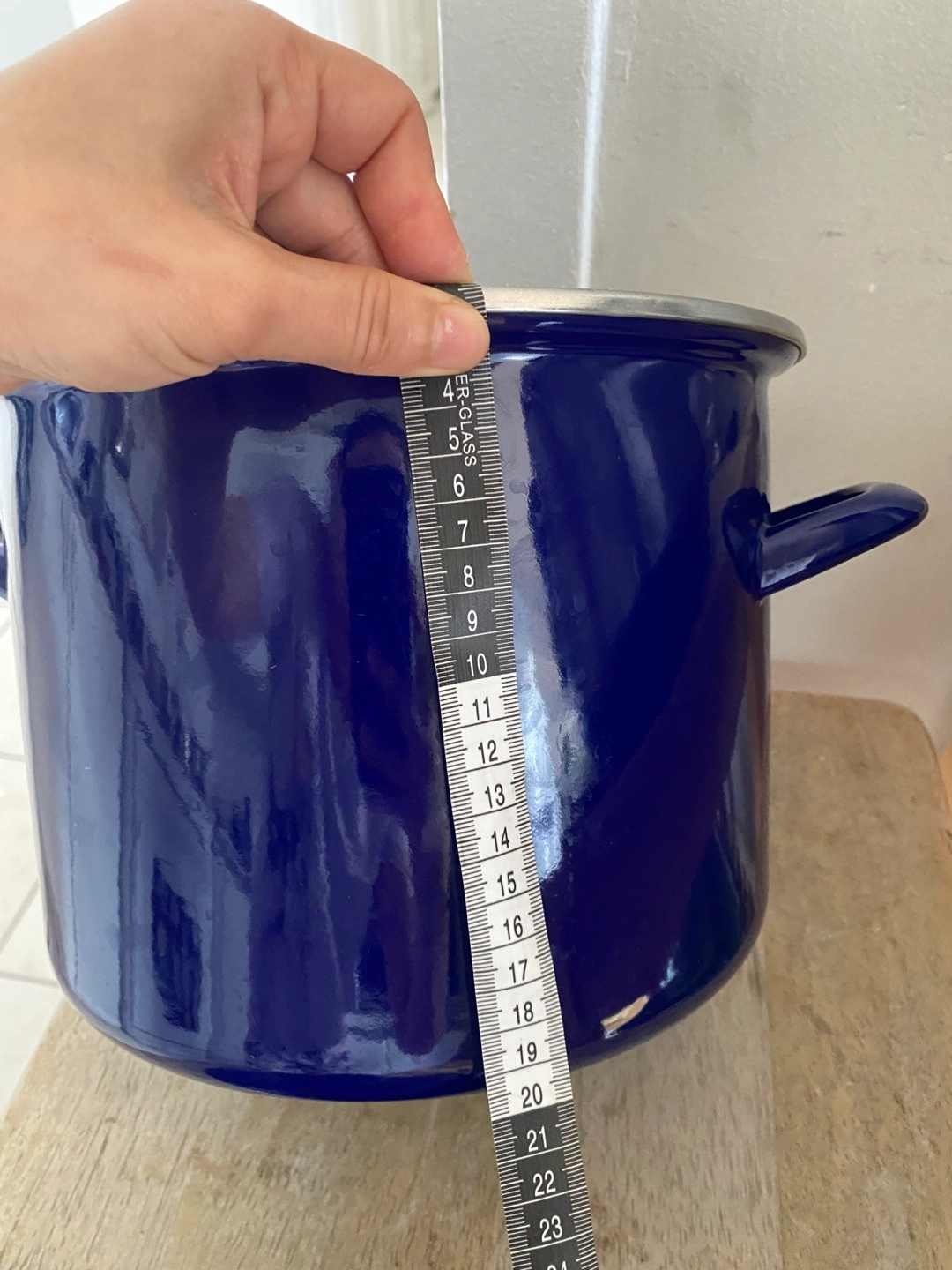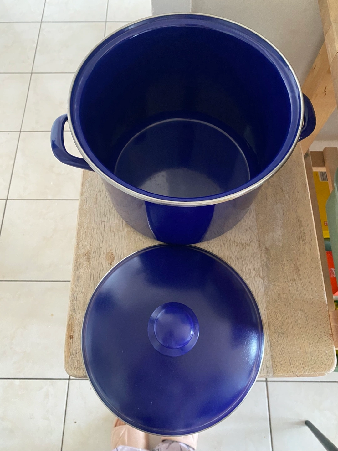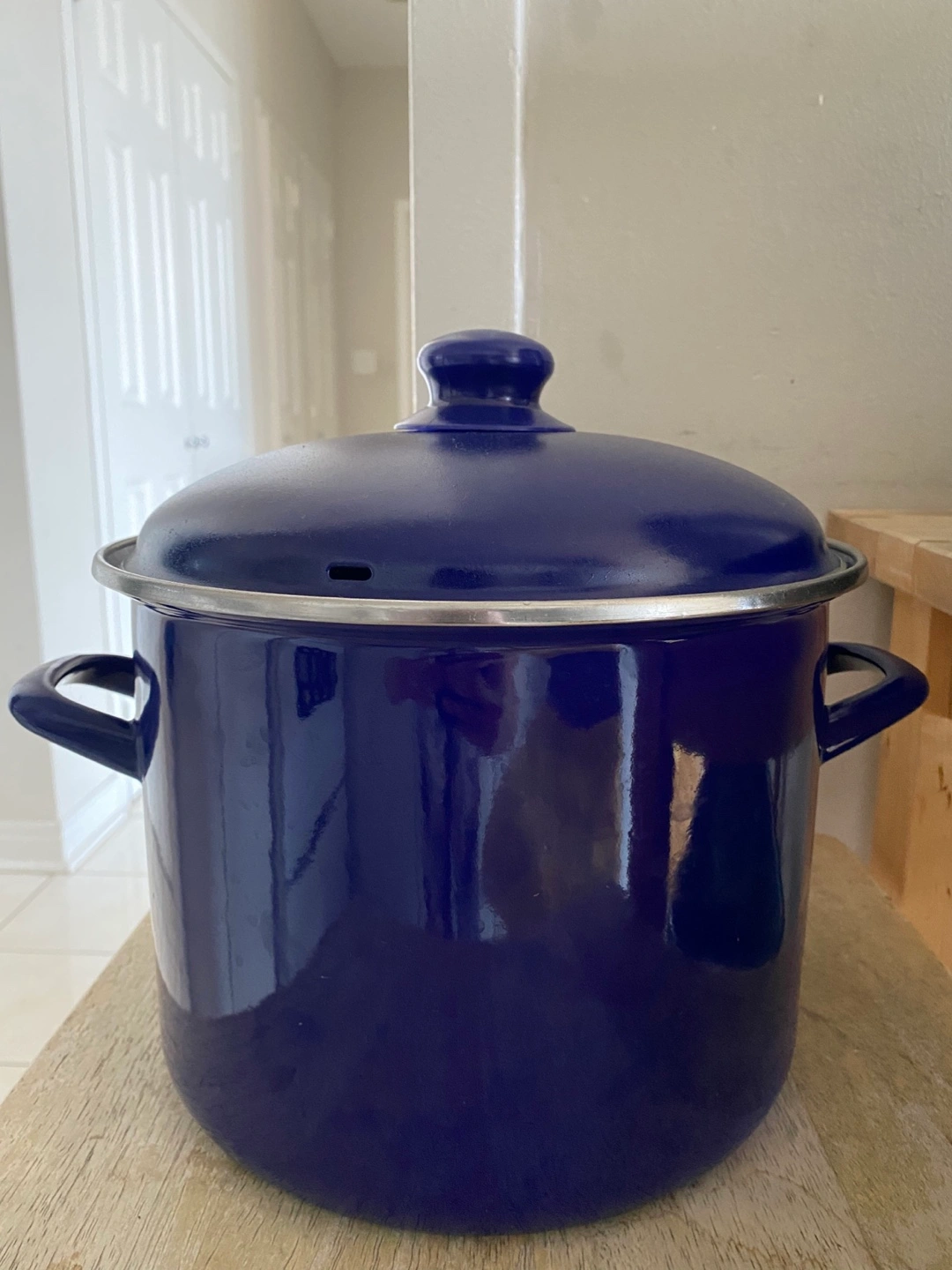 Vintage enamel stock pot. Deep blue color. Silver-toned rim. Two handles. Matching lid. Measures approximately 28 in diameter and 20 tall.