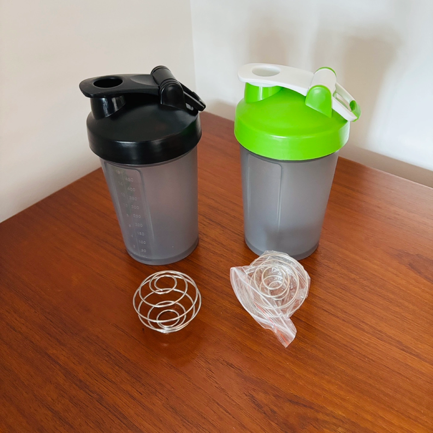 Set of two protein shaker bottles. One black, one green. Includes two wire whisks. Great for gym or home use.