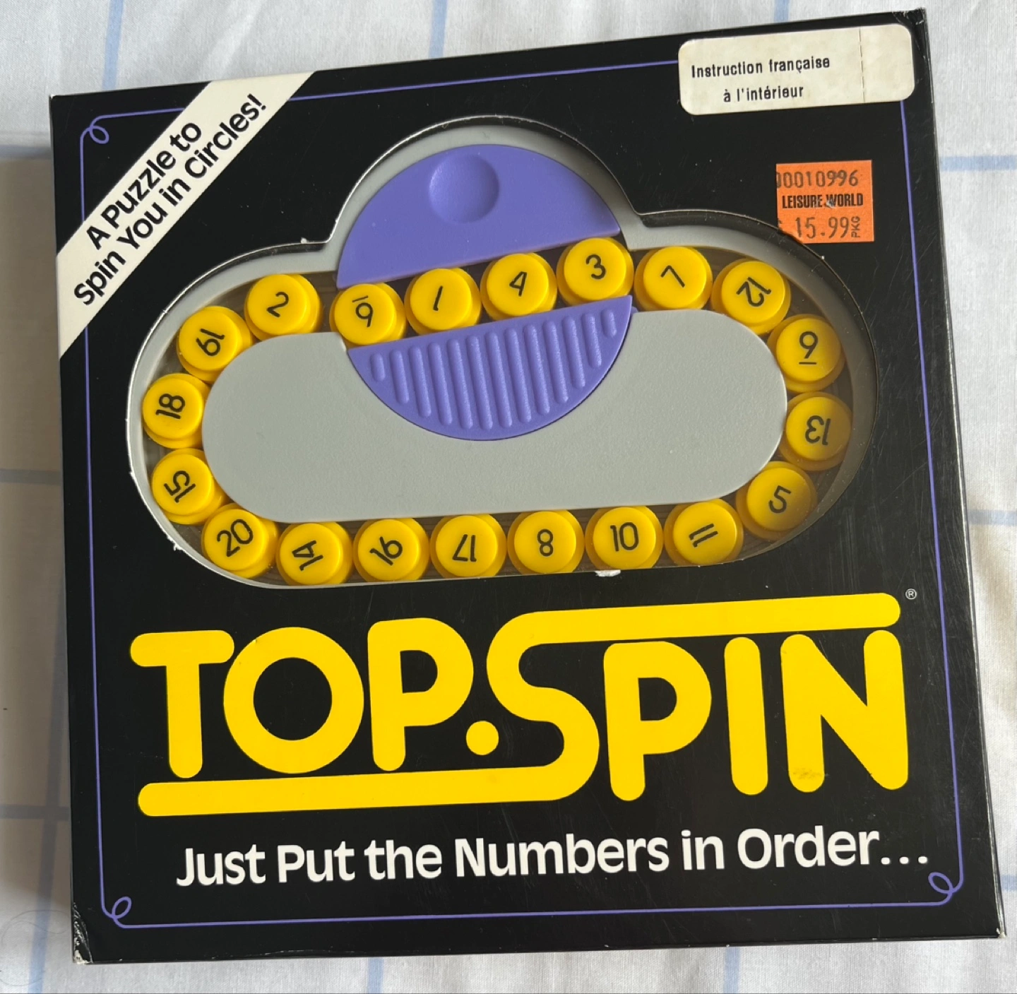 Vintage Top Spin number puzzle. Three ways to play. Includes instructions. Ages 8 and up. Great to exercise the BRAIN 🧠. With Summer coming, it will be great to keep your children occupied while traveling or around the 🏡