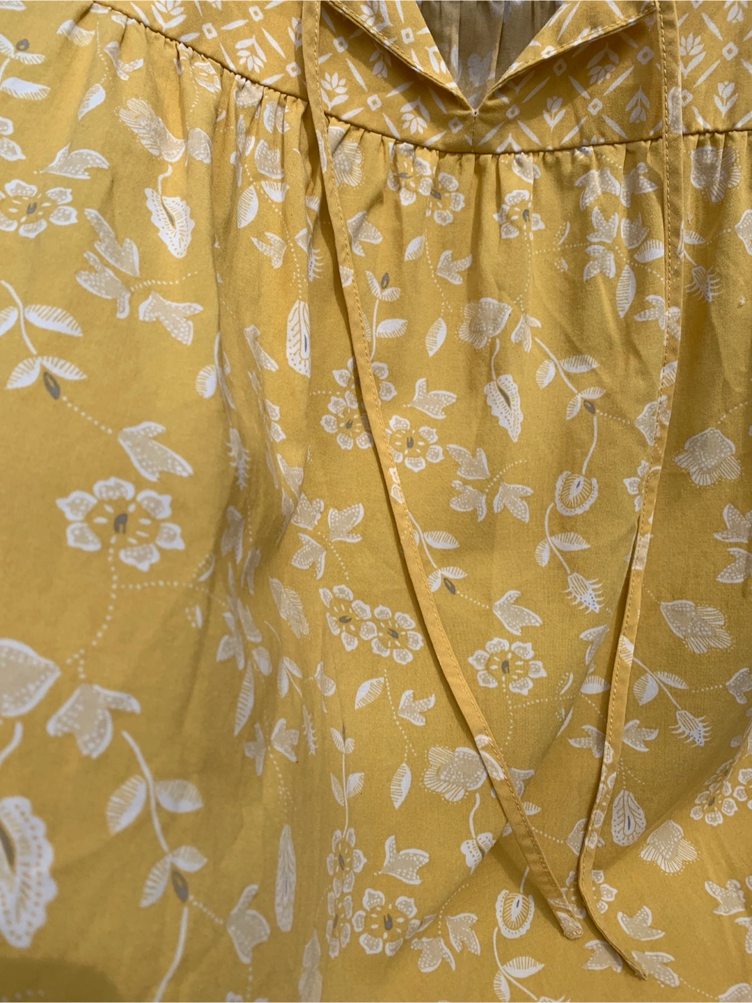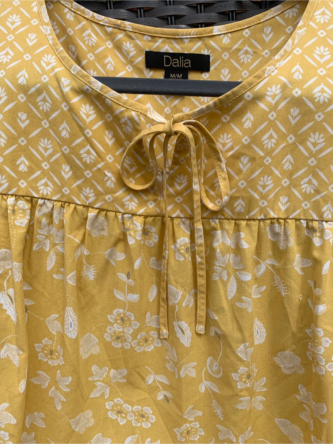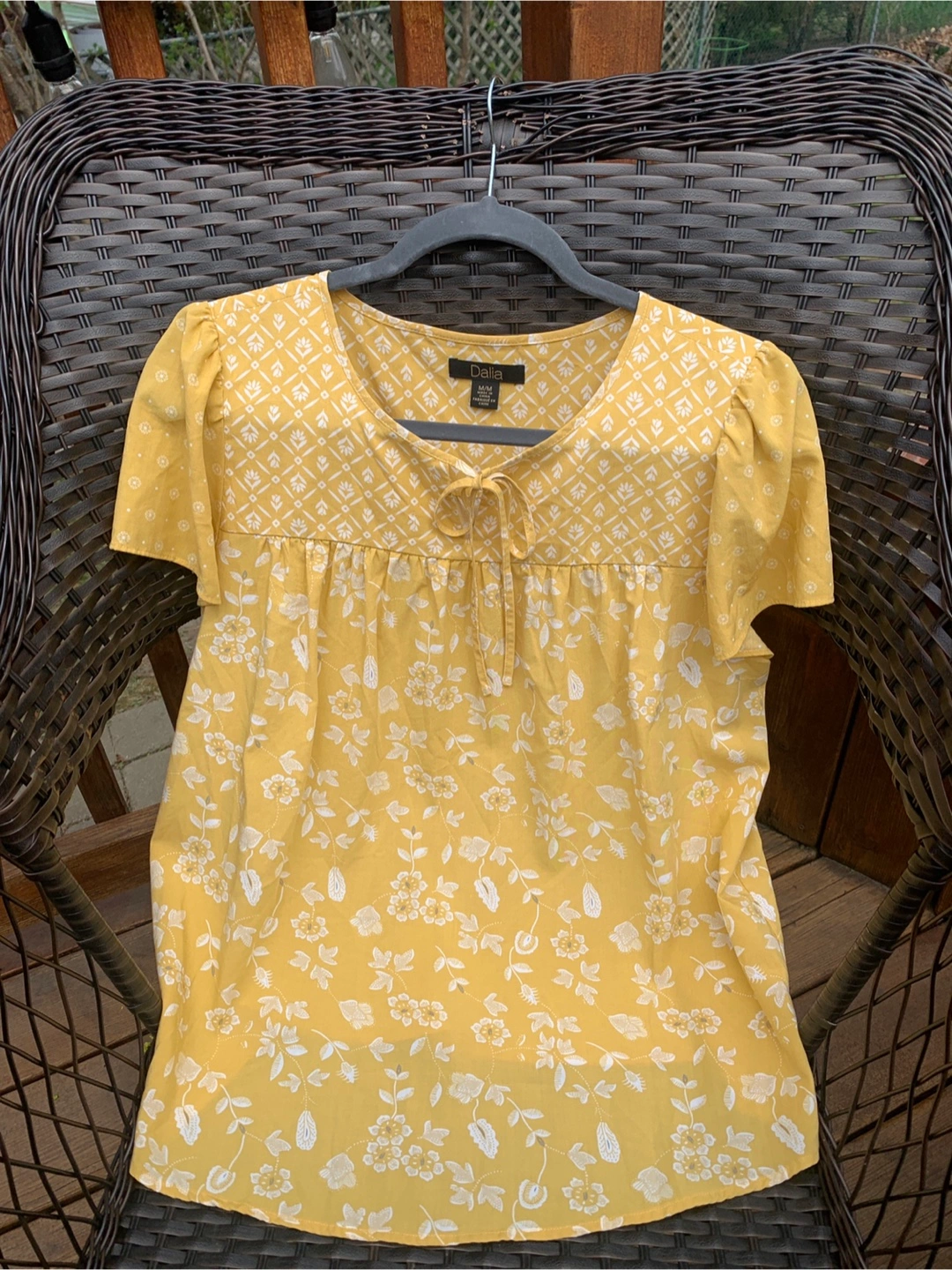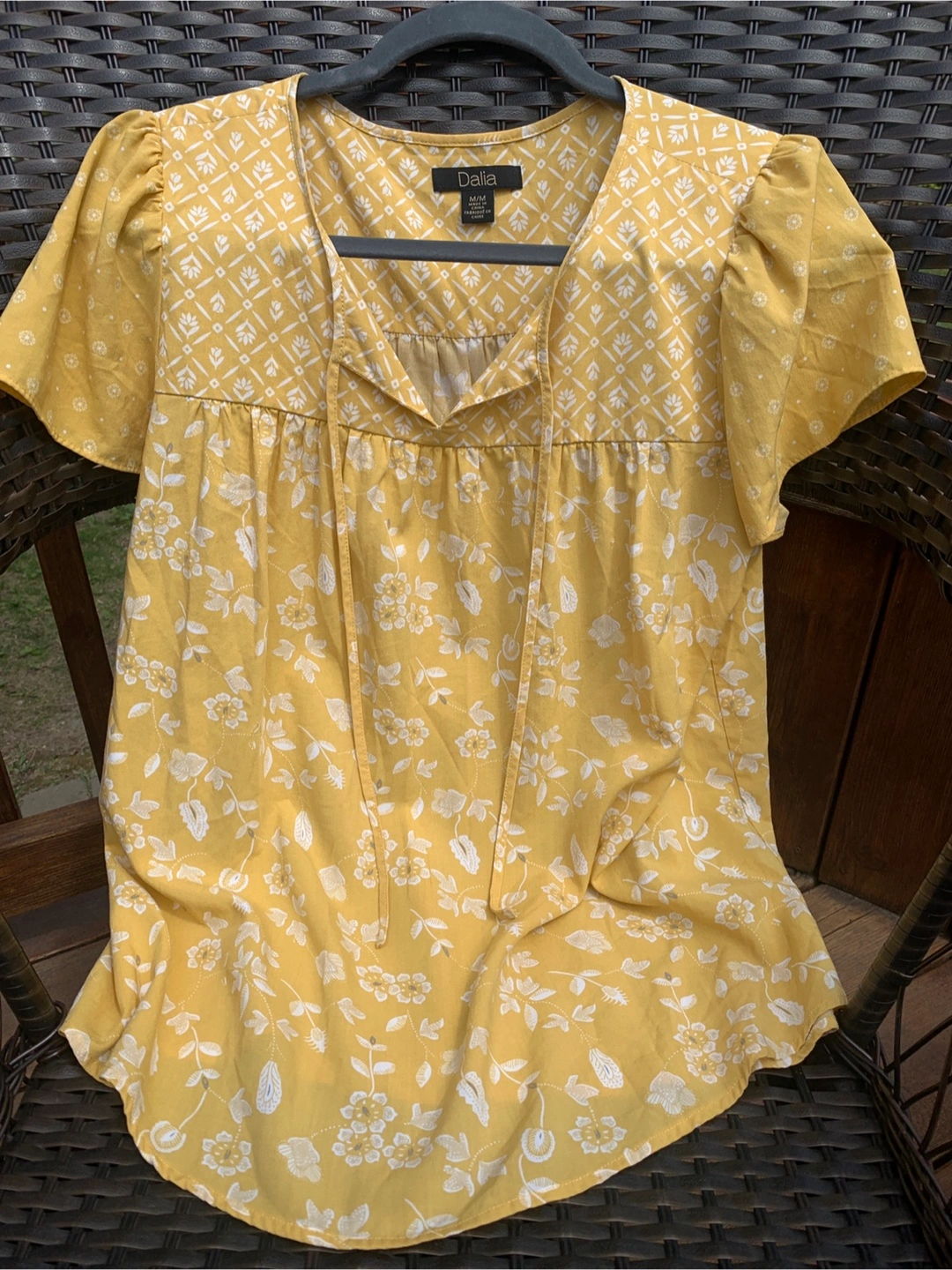 Women’s gorgeous yellow short sleeve blouse by Dalia. Features a floral pattern and a gathered neckline. A bow tie detail at neckline. Beautiful draping fabric. Little cap sleeves in another pattern. Such a cute piece that is right in style for its colour!💛 Cash only please.