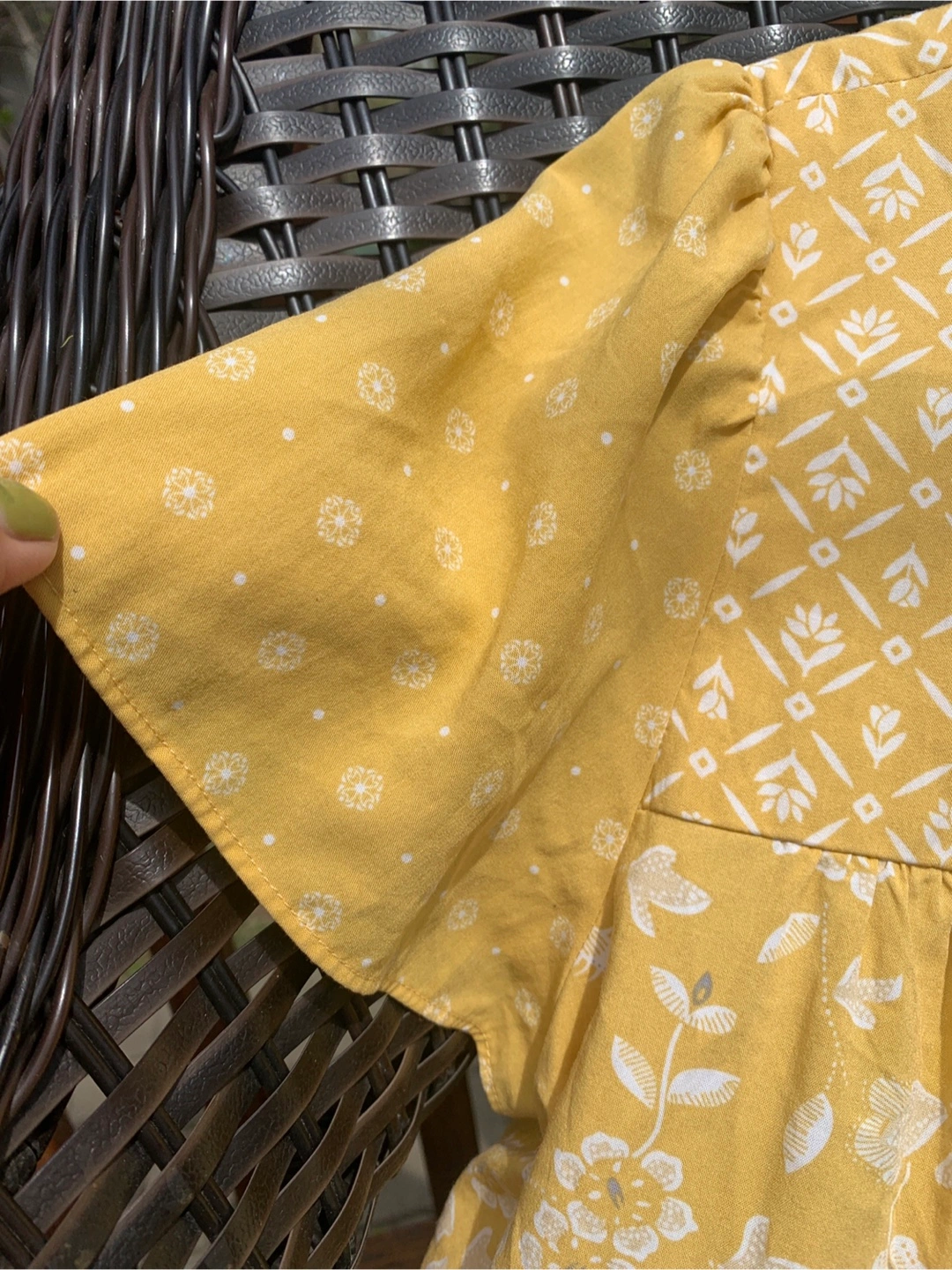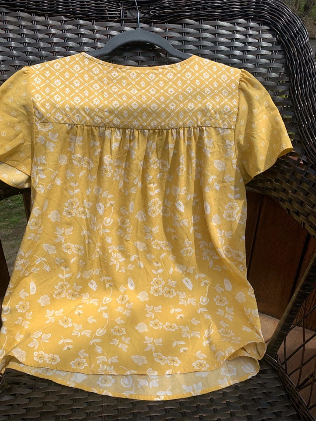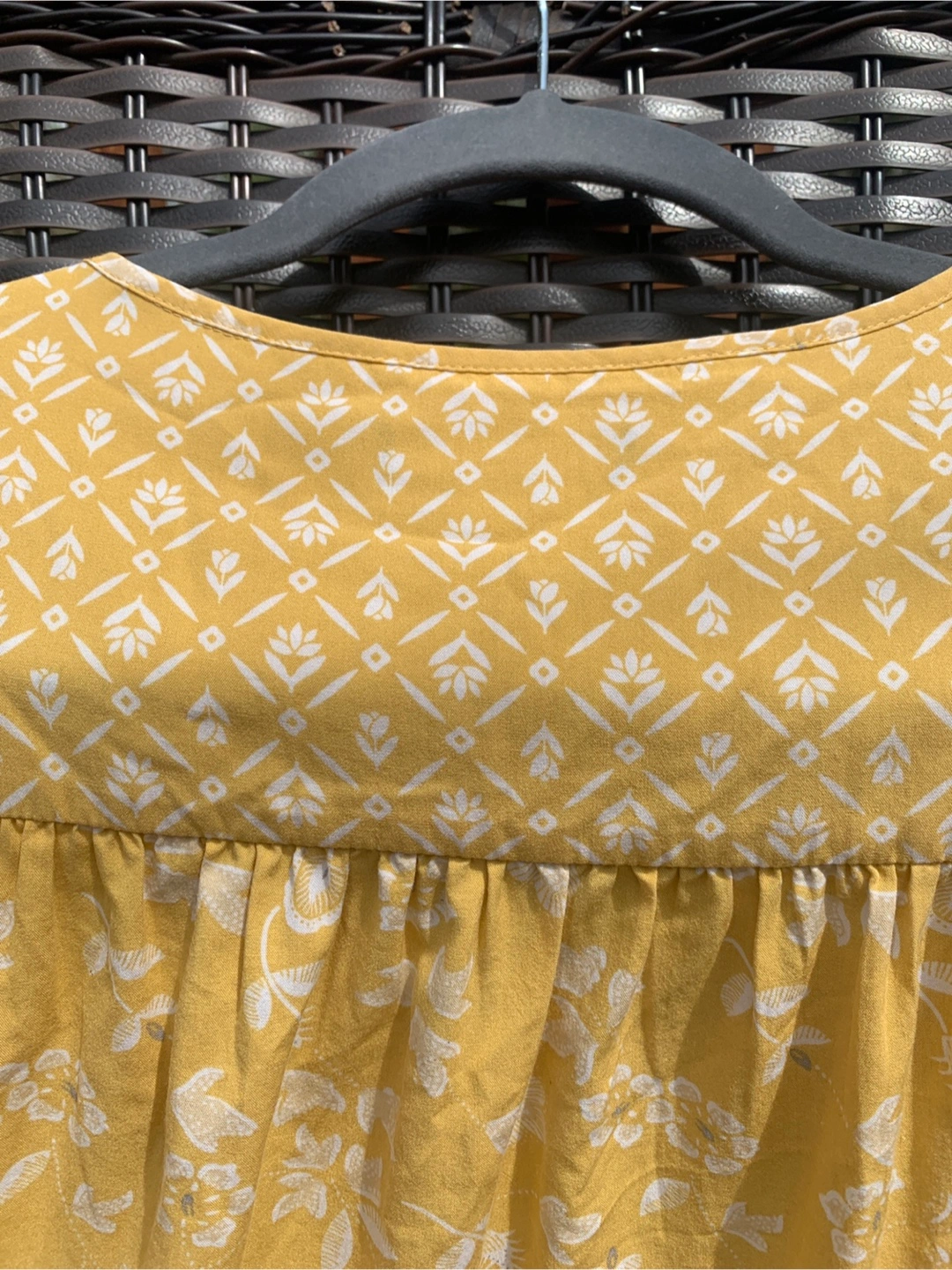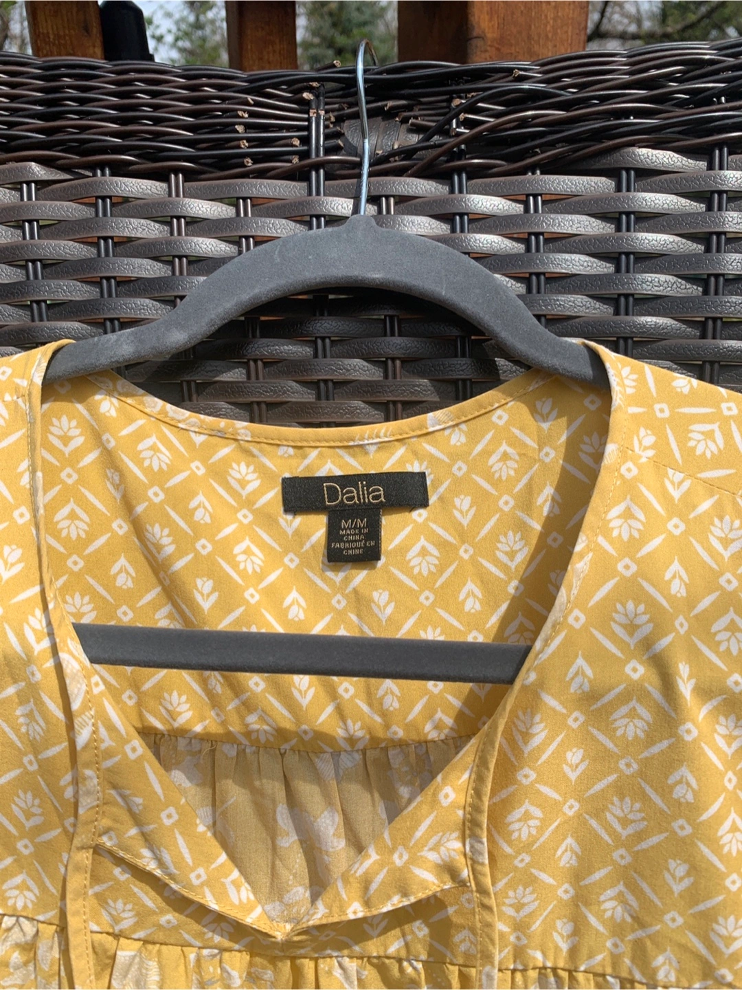 Women’s gorgeous yellow short sleeve blouse by Dalia. Features a floral pattern and a gathered neckline. A bow tie detail at neckline. Beautiful draping fabric. Little cap sleeves in another pattern. Such a cute piece that is right in style for its colour!💛 Cash only please.