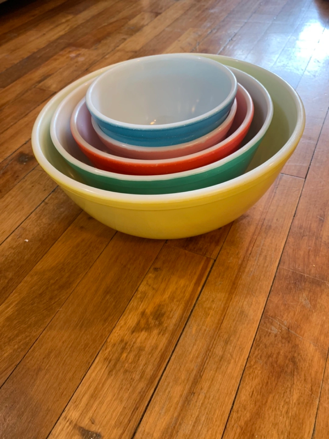 Yellow, green, red and blue original set, extra small pink (same size as blue), insides perfect, outsides only minor wear. Passed down through family. Price is lower than similar offers on eBay/Etsy.