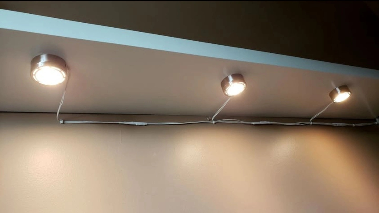 Three puck lights, wiring and hardware included. Stainless steel finish. Easy installation. Great for under-cabinet lighting. Pack of 3 pot lights and switch mechanism Comes with hardware pick it in beechwood