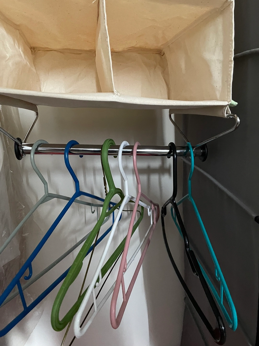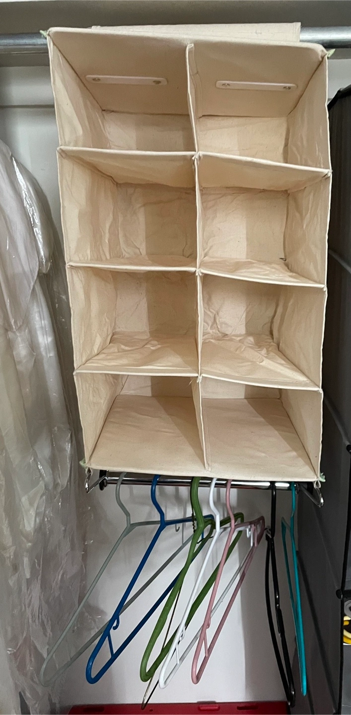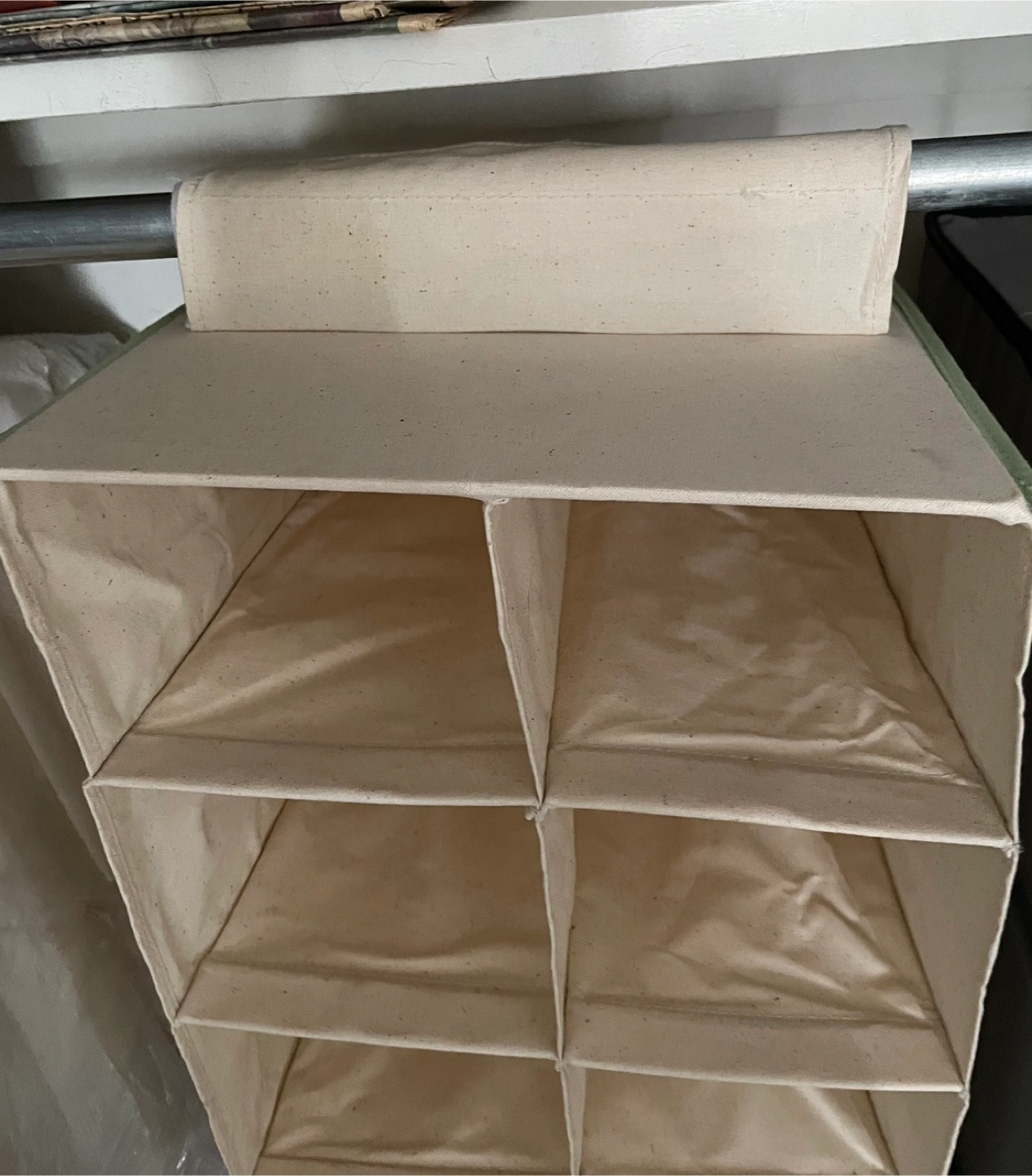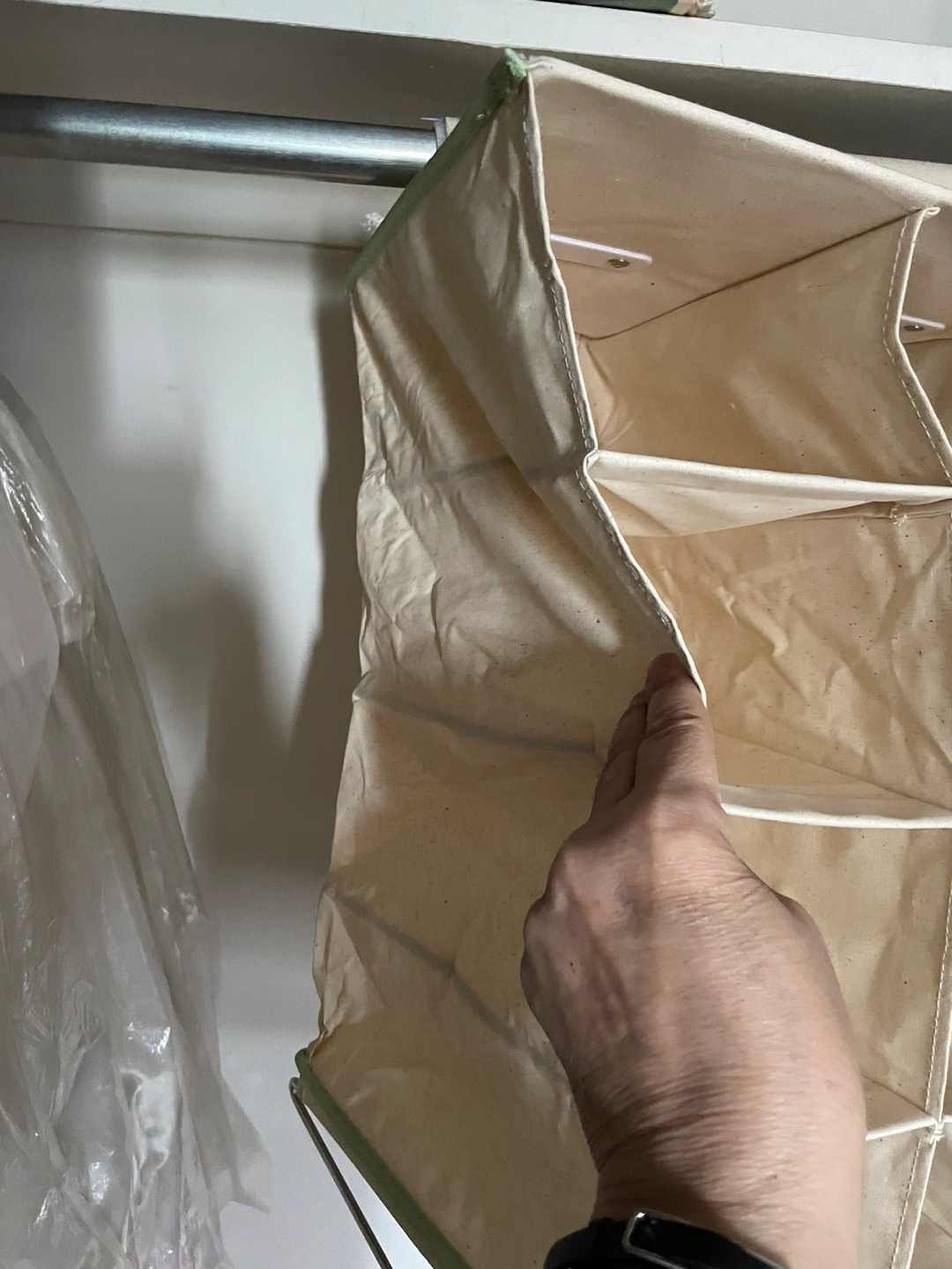 Has reinforced bands, on edges in front of each compartment, so it won’t fold. Beige thick canvas, material. Six compartments and metal bar for clothing with hangers at the bottom. Hangs from closet rod. Great for maximizing closet space.