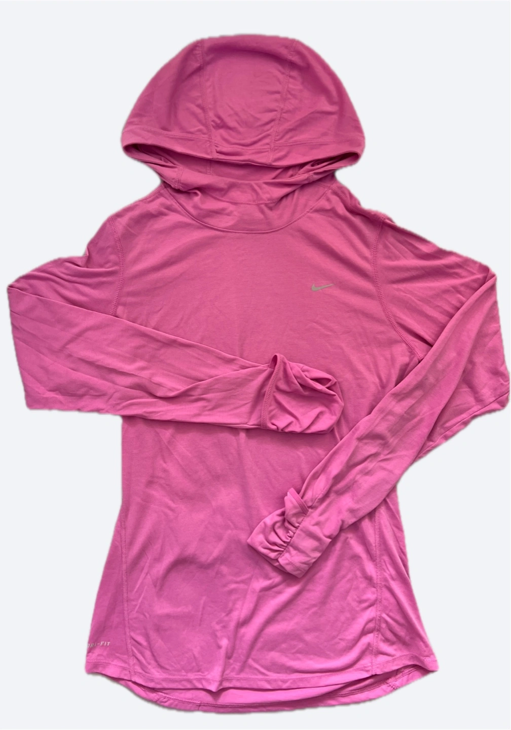 Women's Nike Dri-FIT running hoodie. Size medium. Pink colour. Features a hood with ponytail hole and a zippered pocket. Long sleeves with thumbholes. Great for workouts or casual wear.