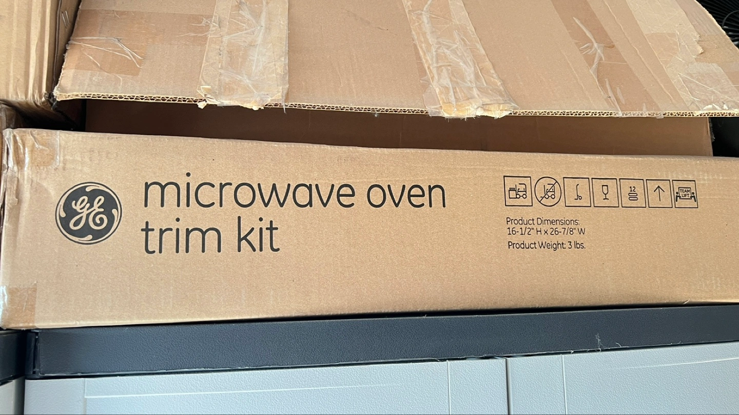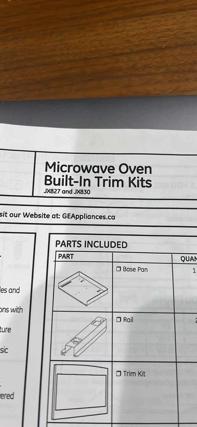 New GE microwave oven trim kit. Includes base pan, rail, and trim kit. For models JX827 and JX830. Microwave NOT included.