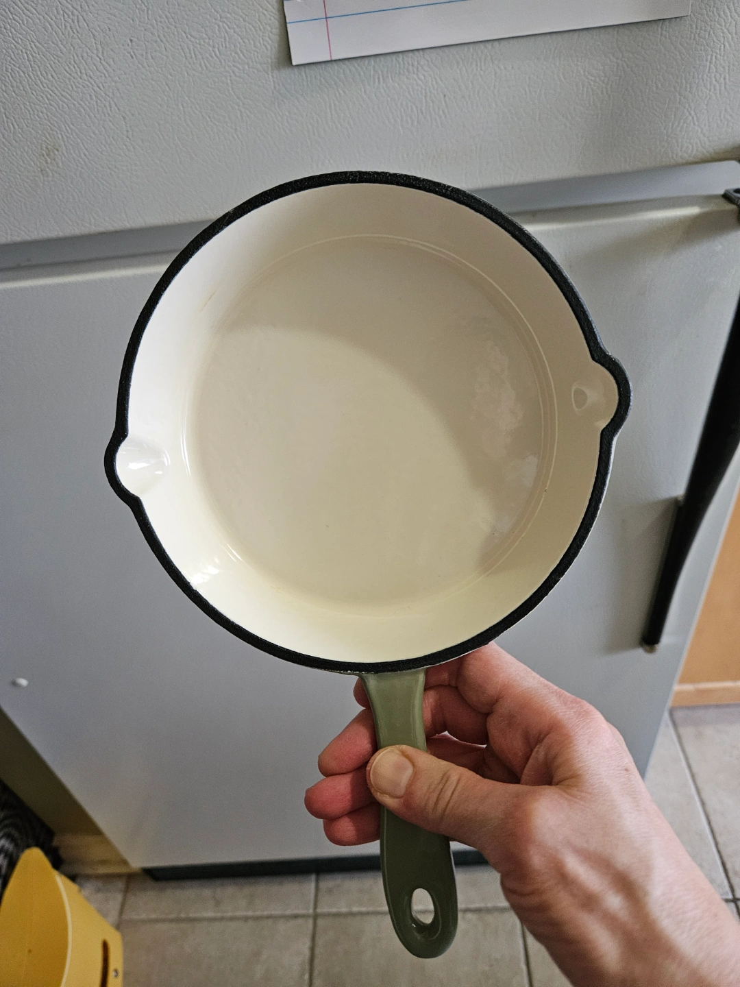 Small cast iron skillet. Sage green colour. Excellent for stovetop cooking. Pre-owned. 6.5 inches.