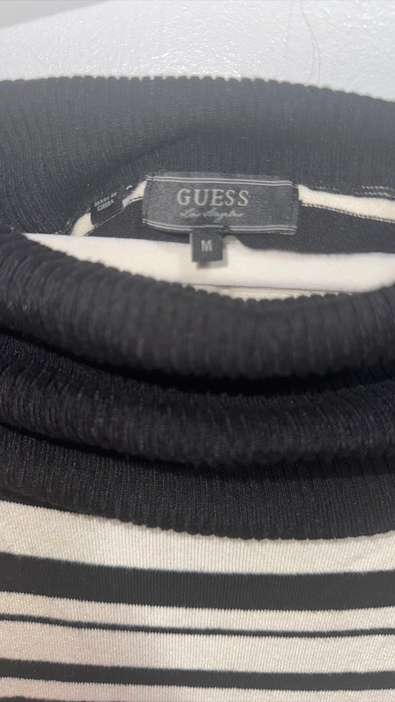 Women's GUESS sweater dress. Black and white horizontal stripes. Long sleeves. Cowl neck. Size Medium. Made in China.