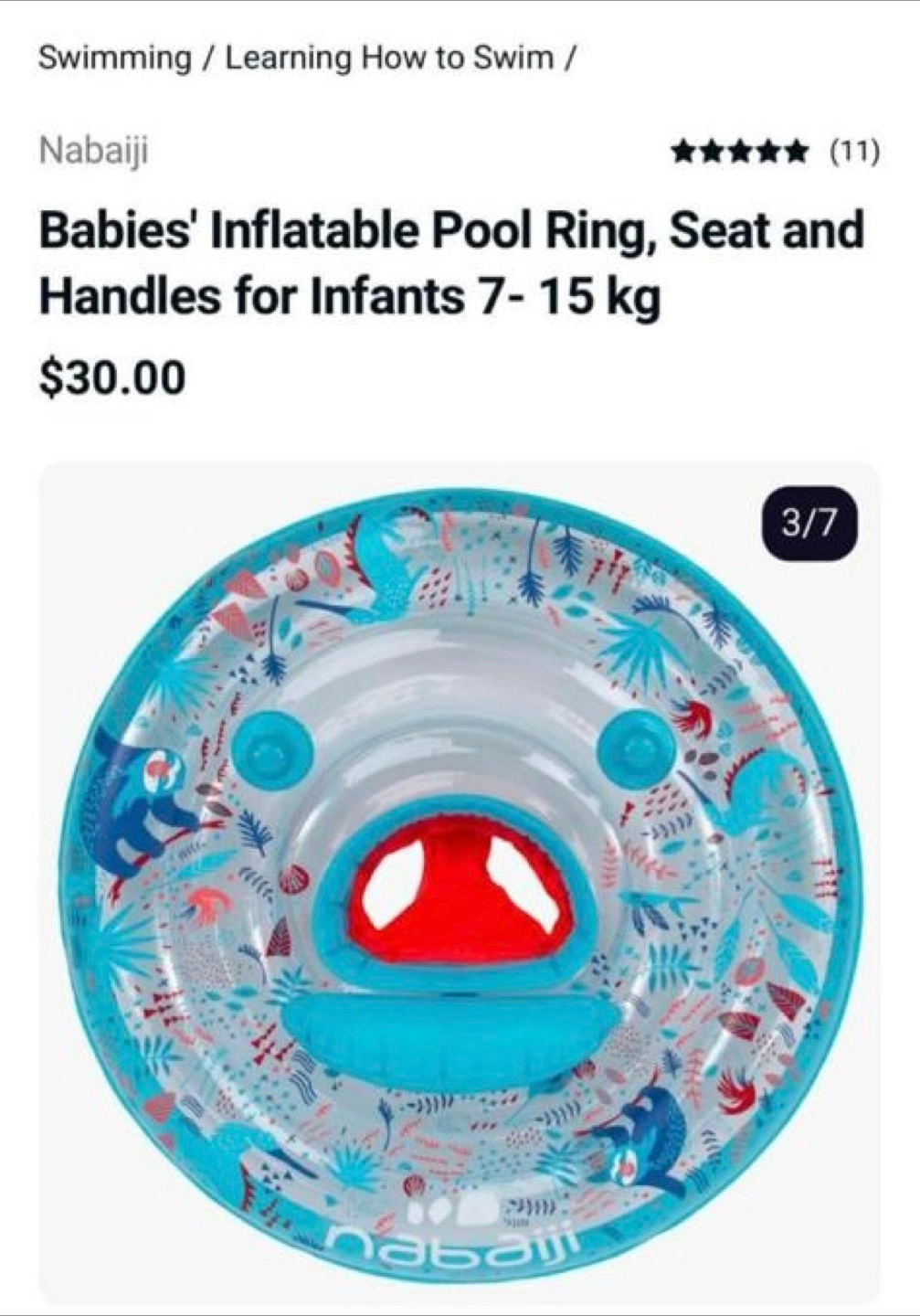 Inflatable pool ring for babies. Suitable for infants 7-15 kg. Features a seat and handles. Fun dinosaur design. Pick-up in Aurora / Richmond hill