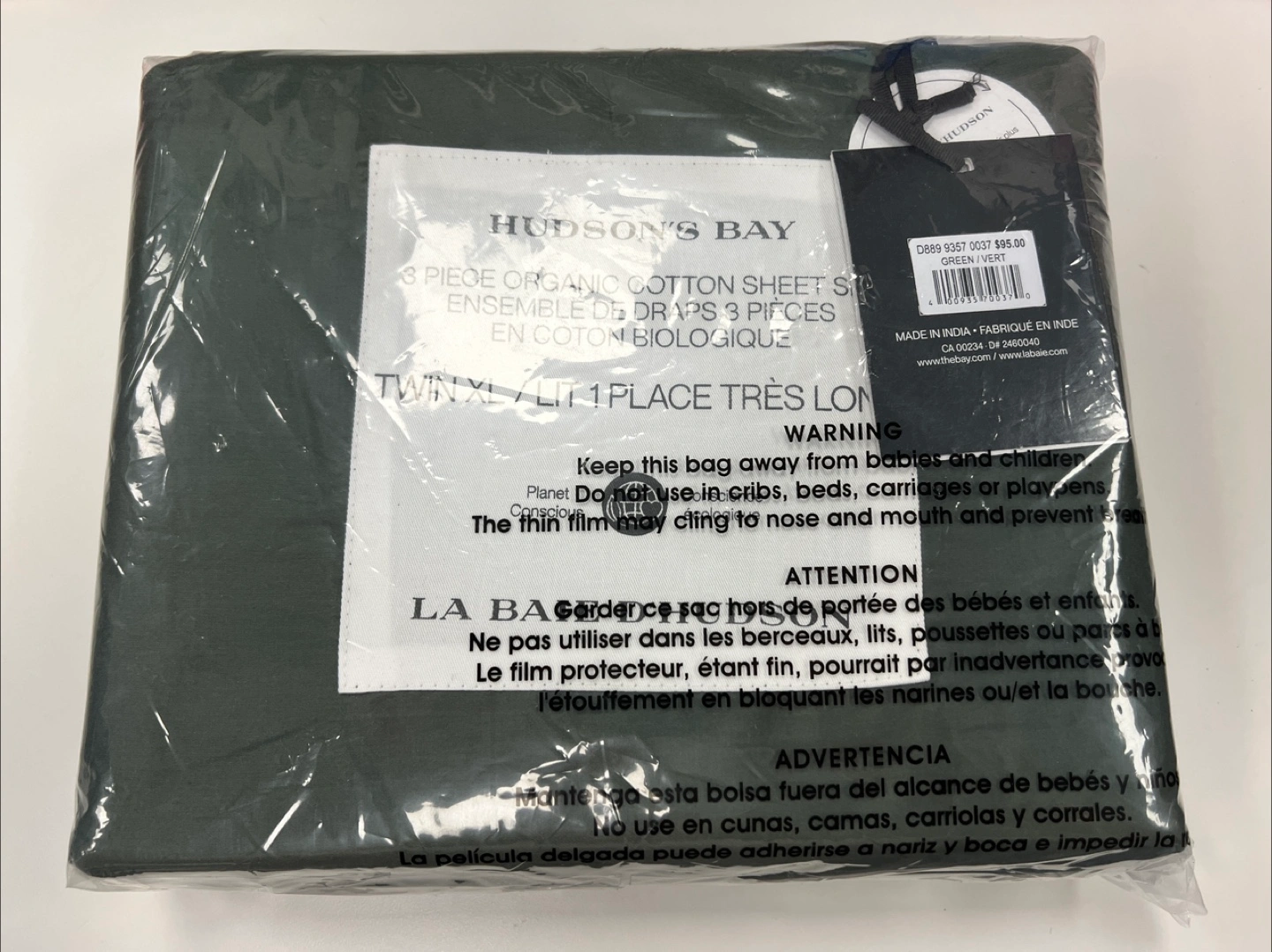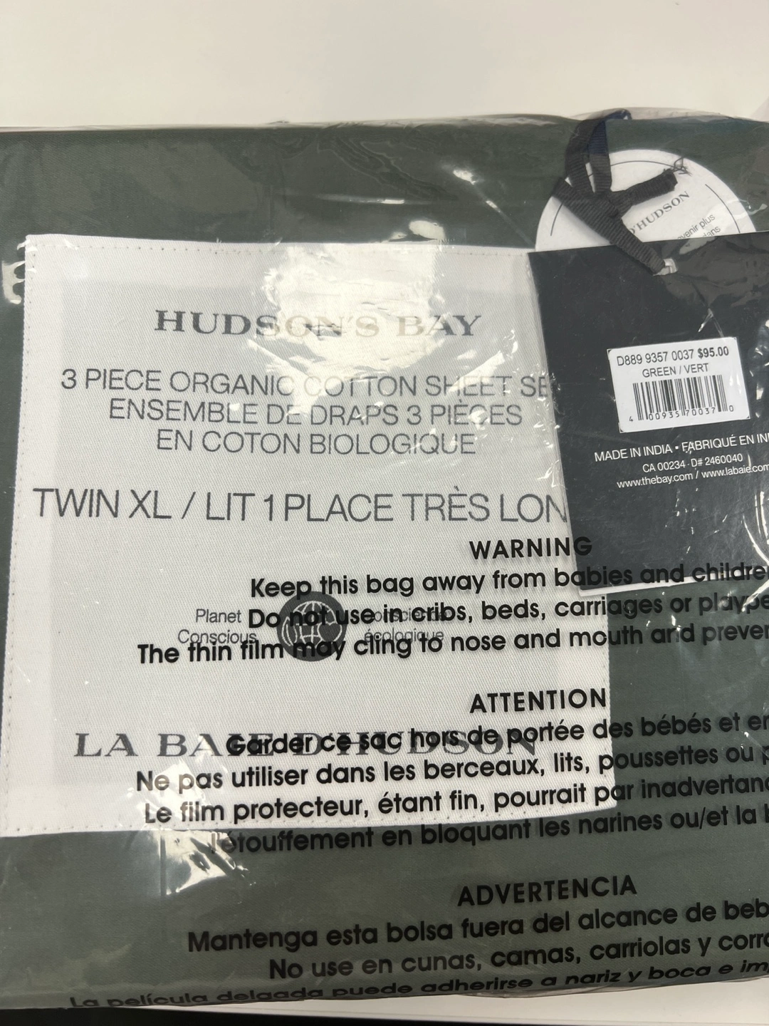 New, never used Hudson's Bay organic cotton twin XL sheet set. Three pieces. Dark geeen colour. Never opened