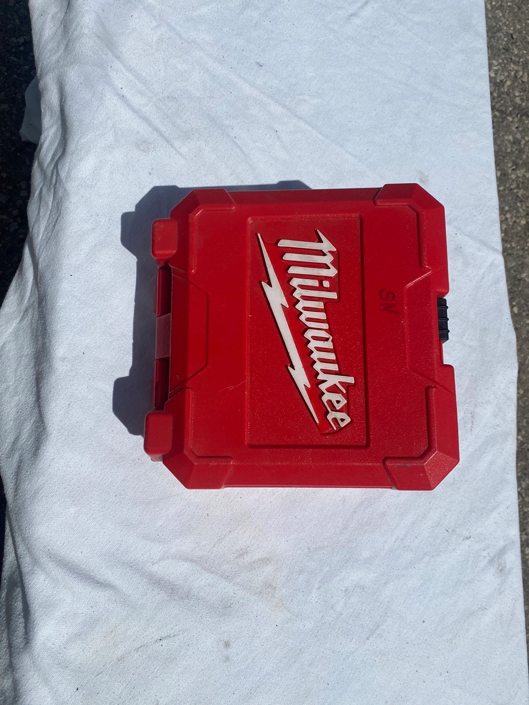 Complete hole saw set. Red plastic carrying case. Various sized hole saws and drill bits included.