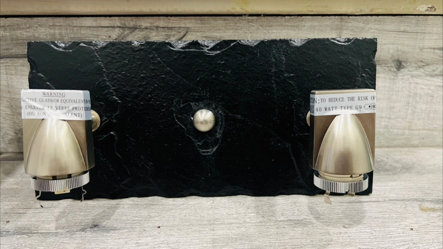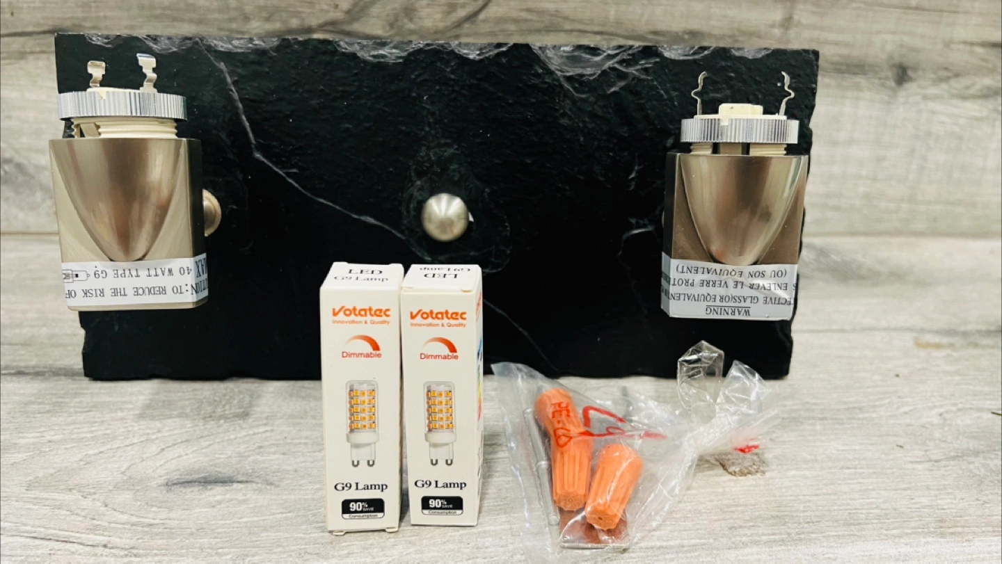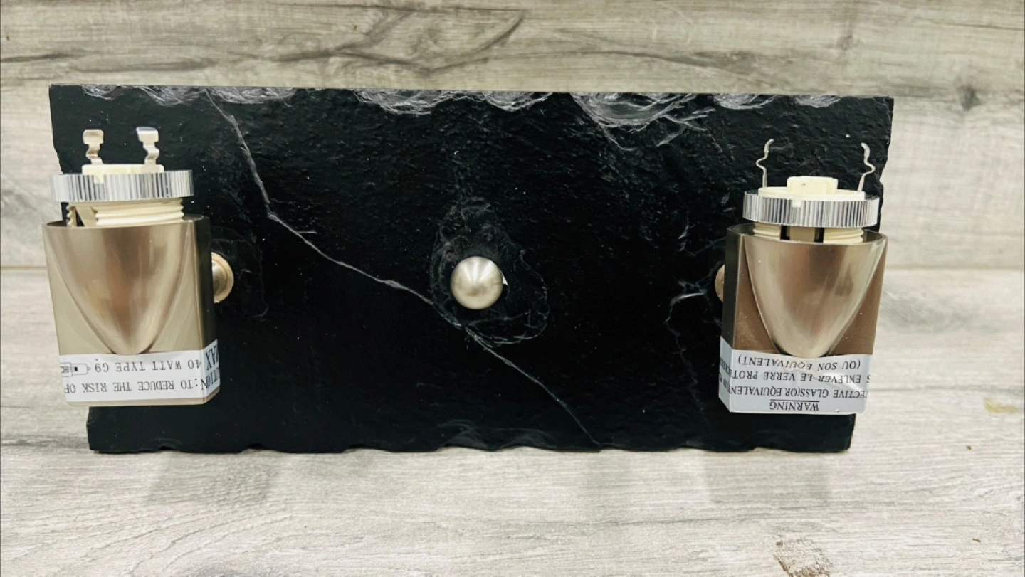 Double wall sconce, brushed nickel finish. Slate backing. Includes two G9 LED bulbs and rubber grommets. New in box. Max 40 watt G9 bulbs.