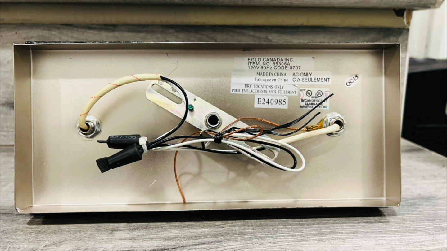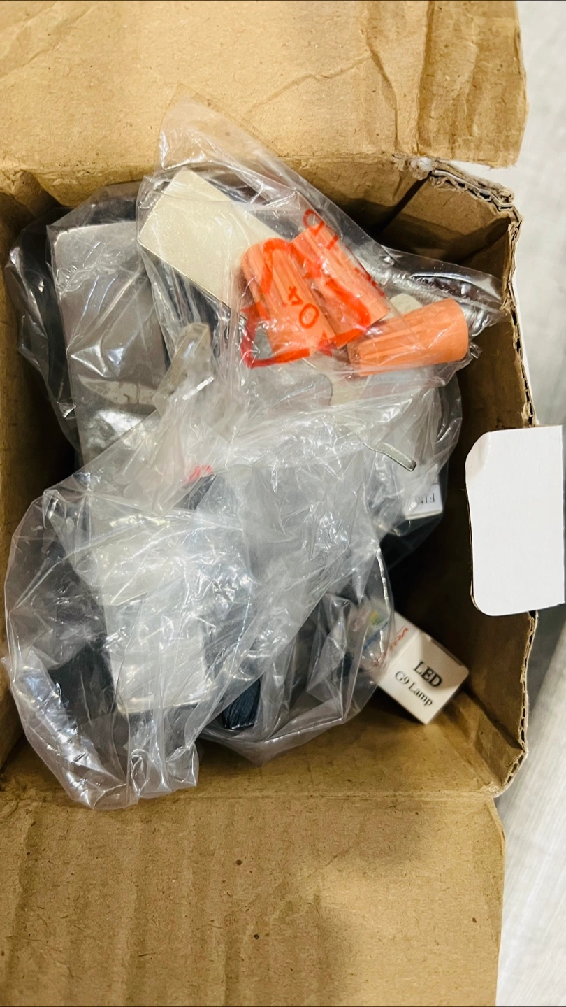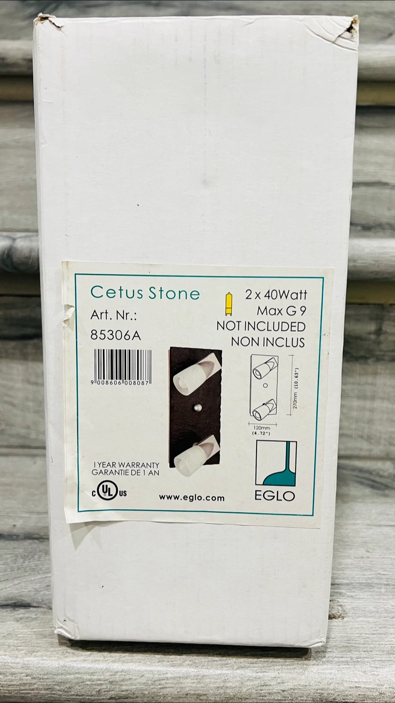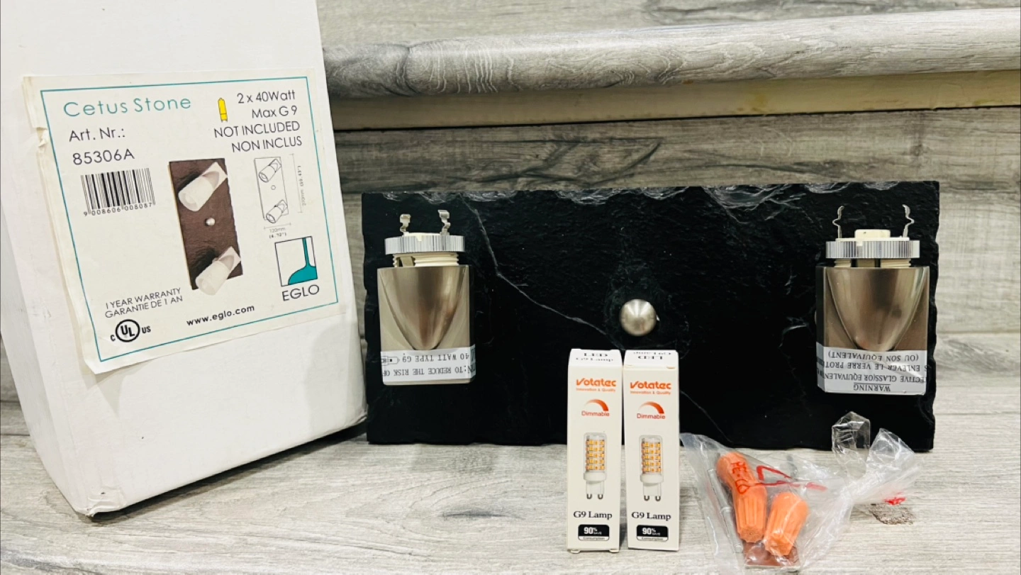Double wall sconce, brushed nickel finish. Slate backing. Includes two G9 LED bulbs and rubber grommets. New in box. Max 40 watt G9 bulbs.