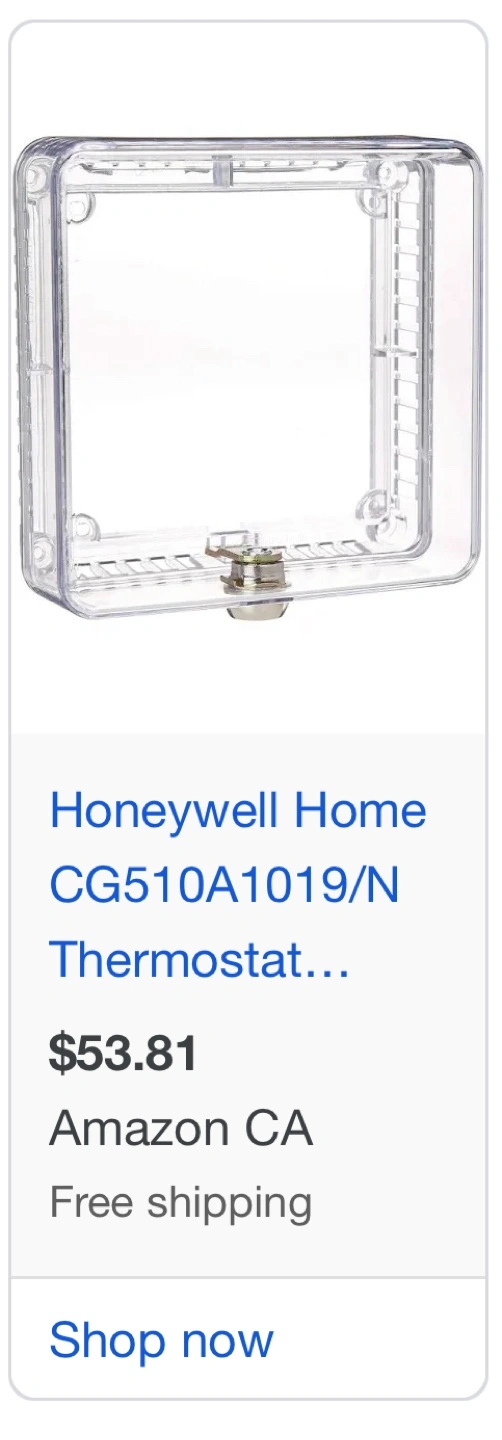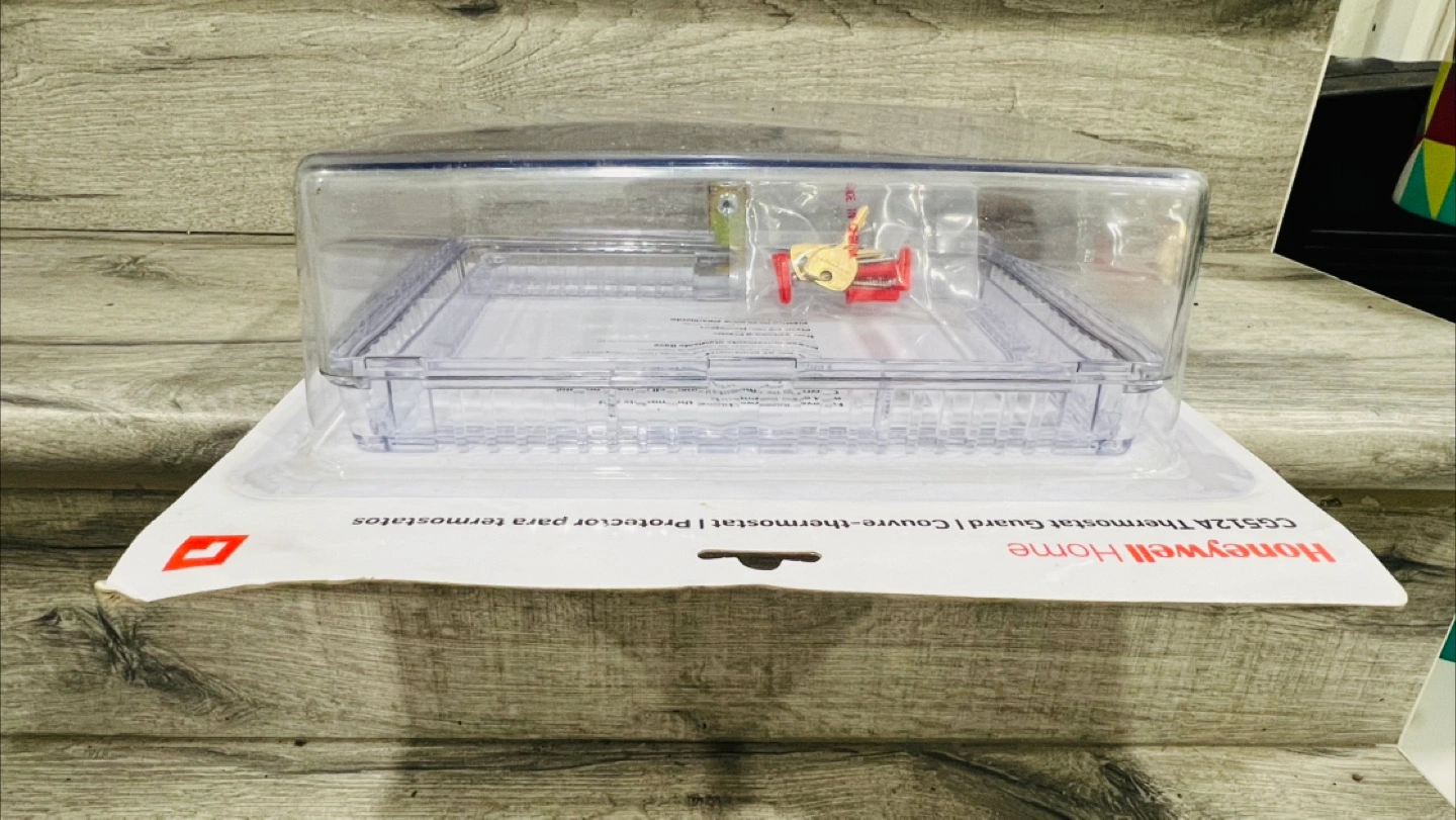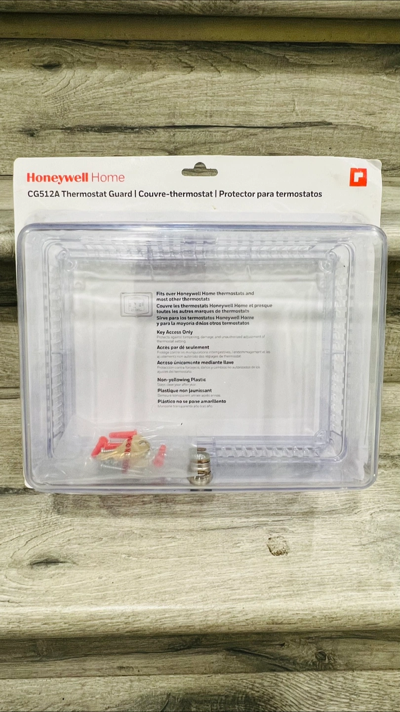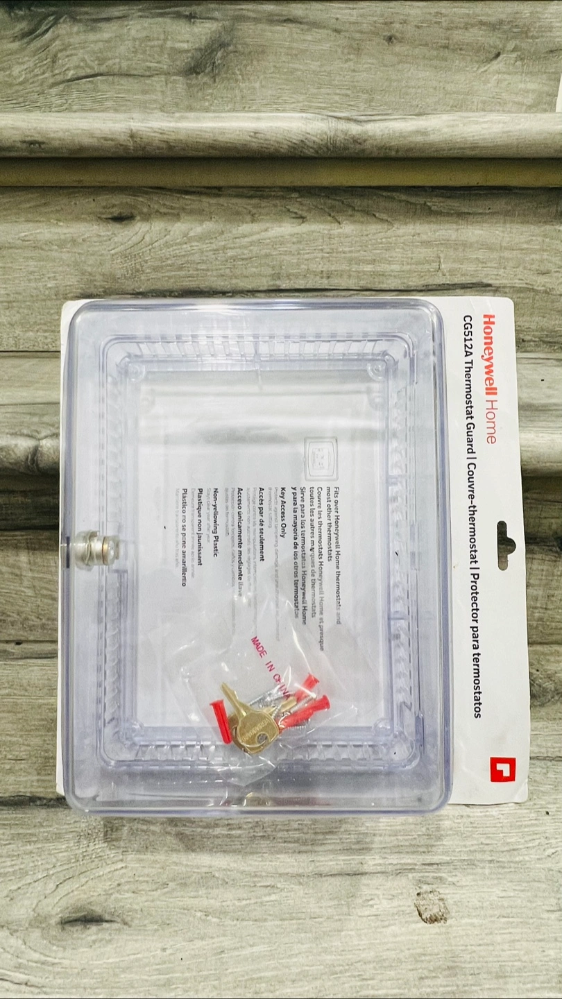 Clear plastic thermostat cover. Includes key and mounting hardware. Fits most thermostats. Brand new.