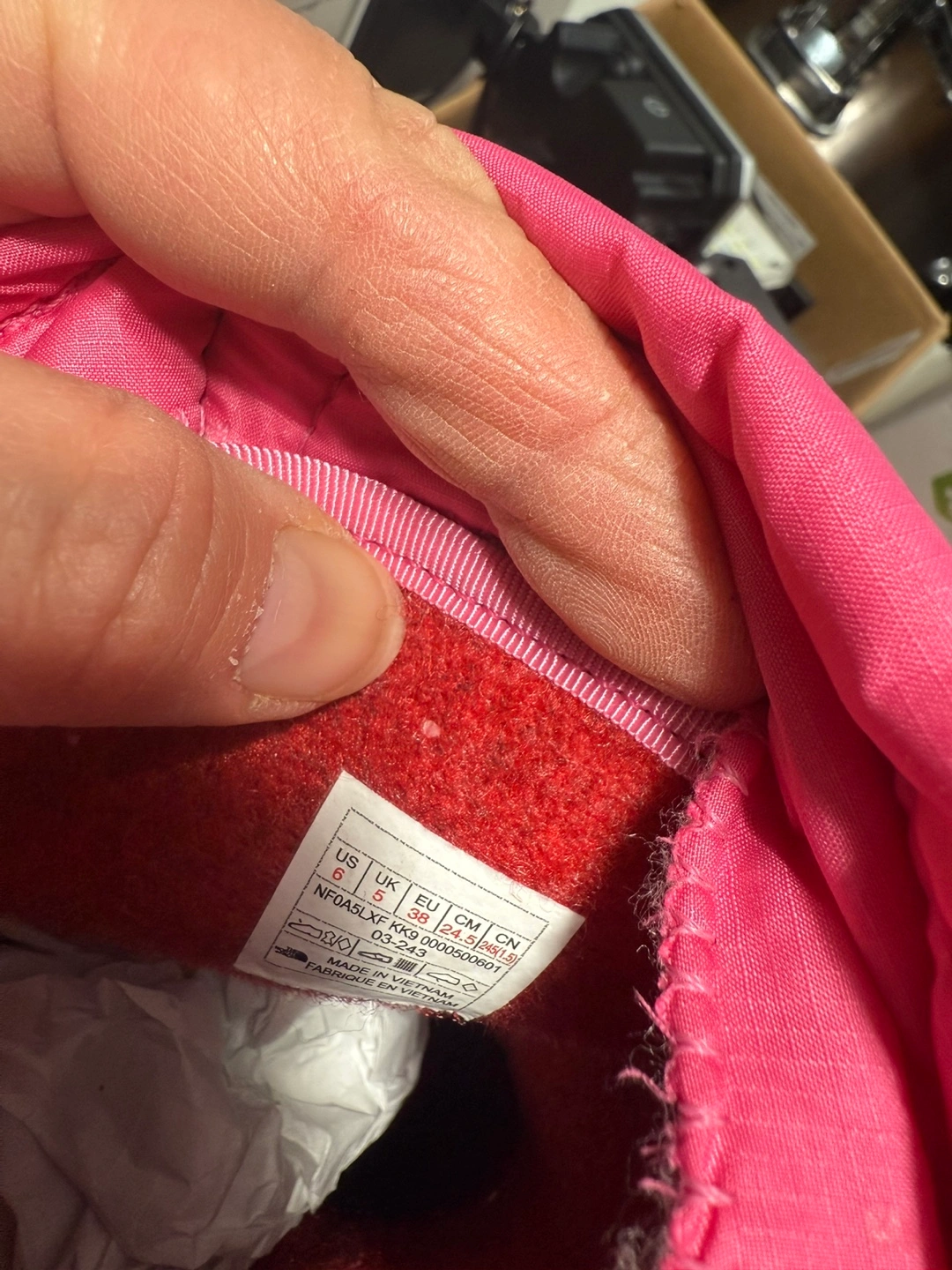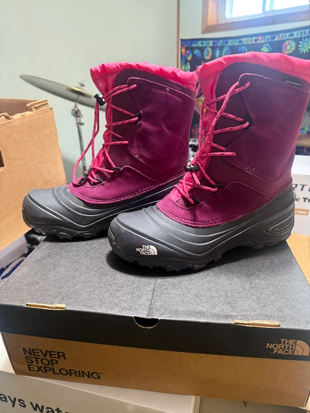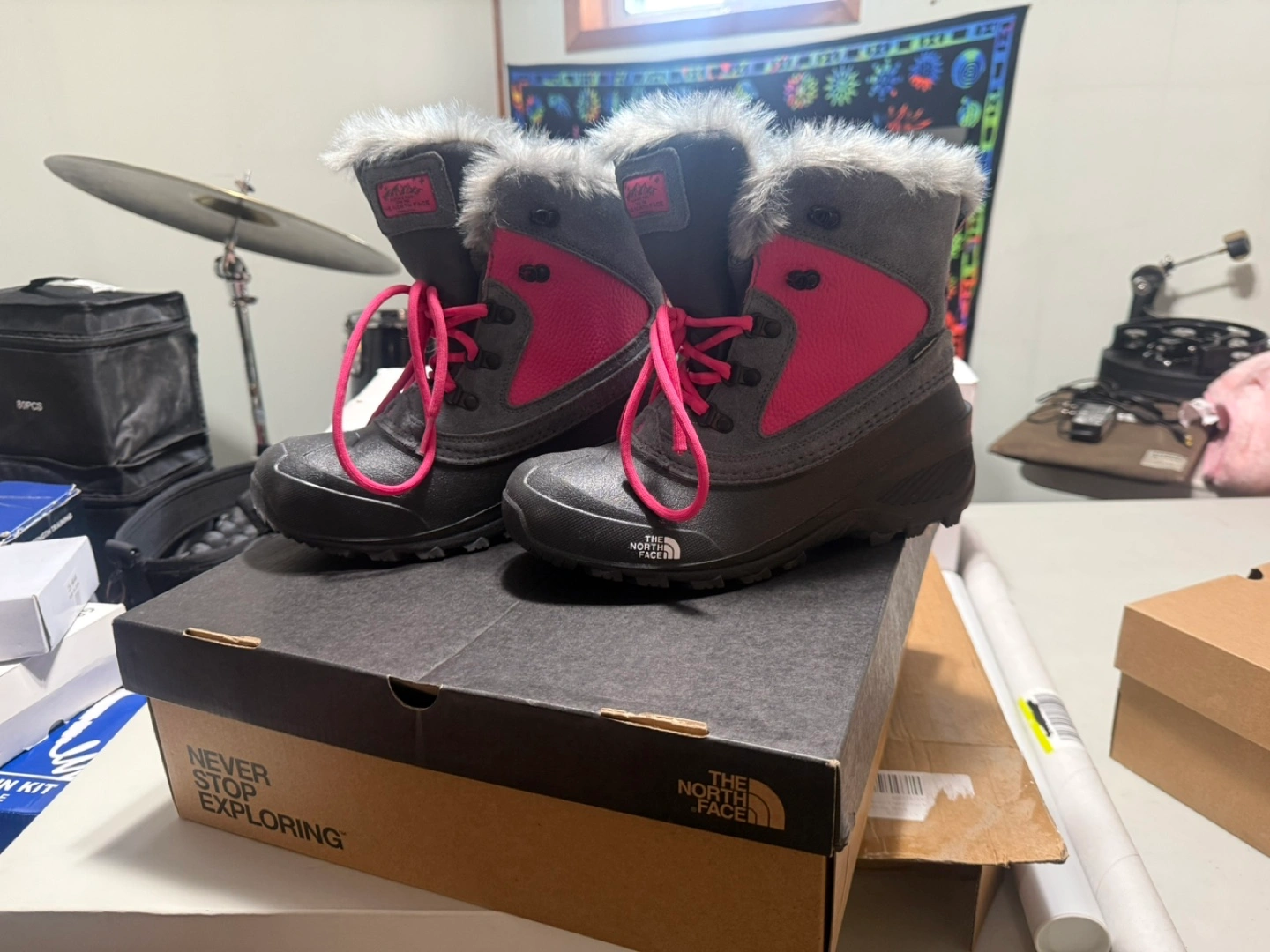 Pair of The North Face girls' winter boots. Grey and pink. Size 7. Faux fur trim. Lace-up closure. Good condition. In original box. $80 for one,150 for 2 paris