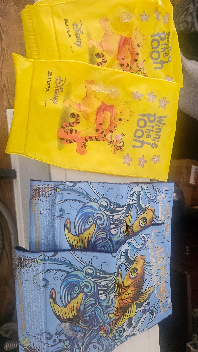 Two pairs of kids' swim arm floaties. One pair features Winnie the Pooh and Tigger. The other pair features an Ed Hardy design with koi fish. #freecycle