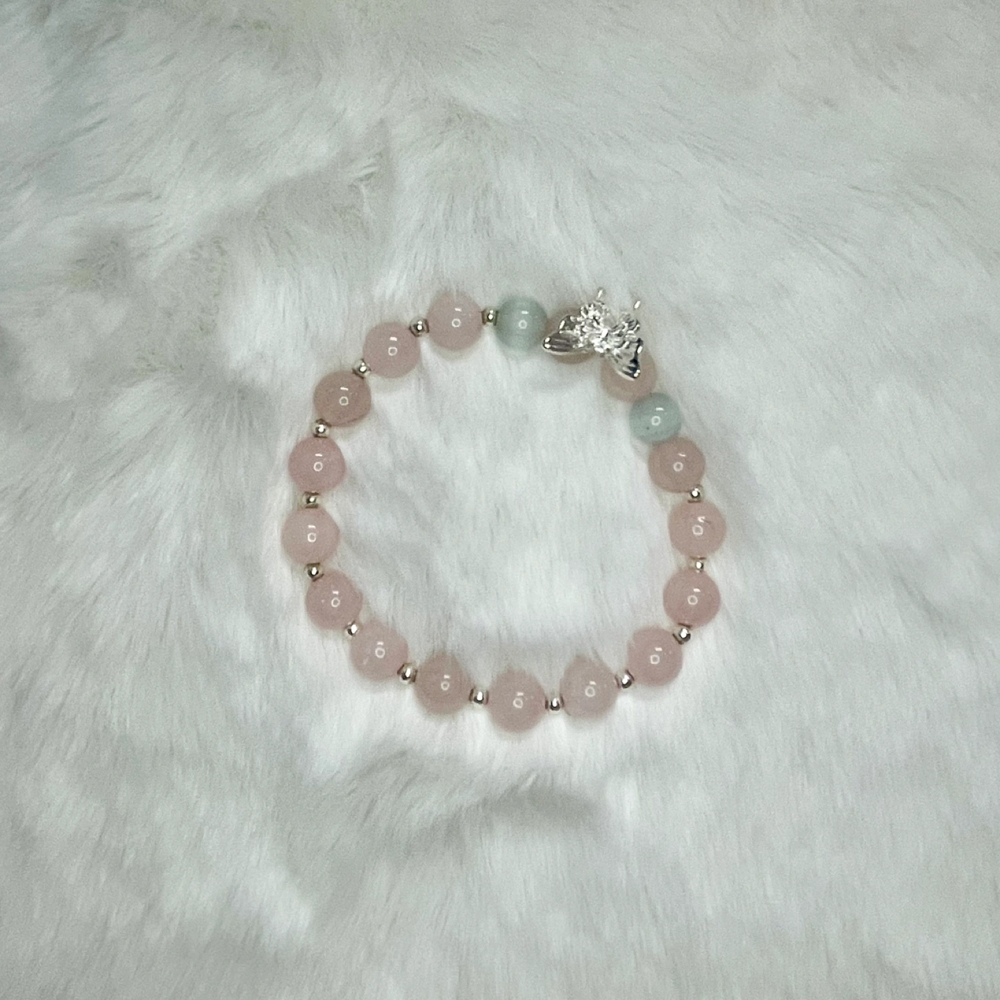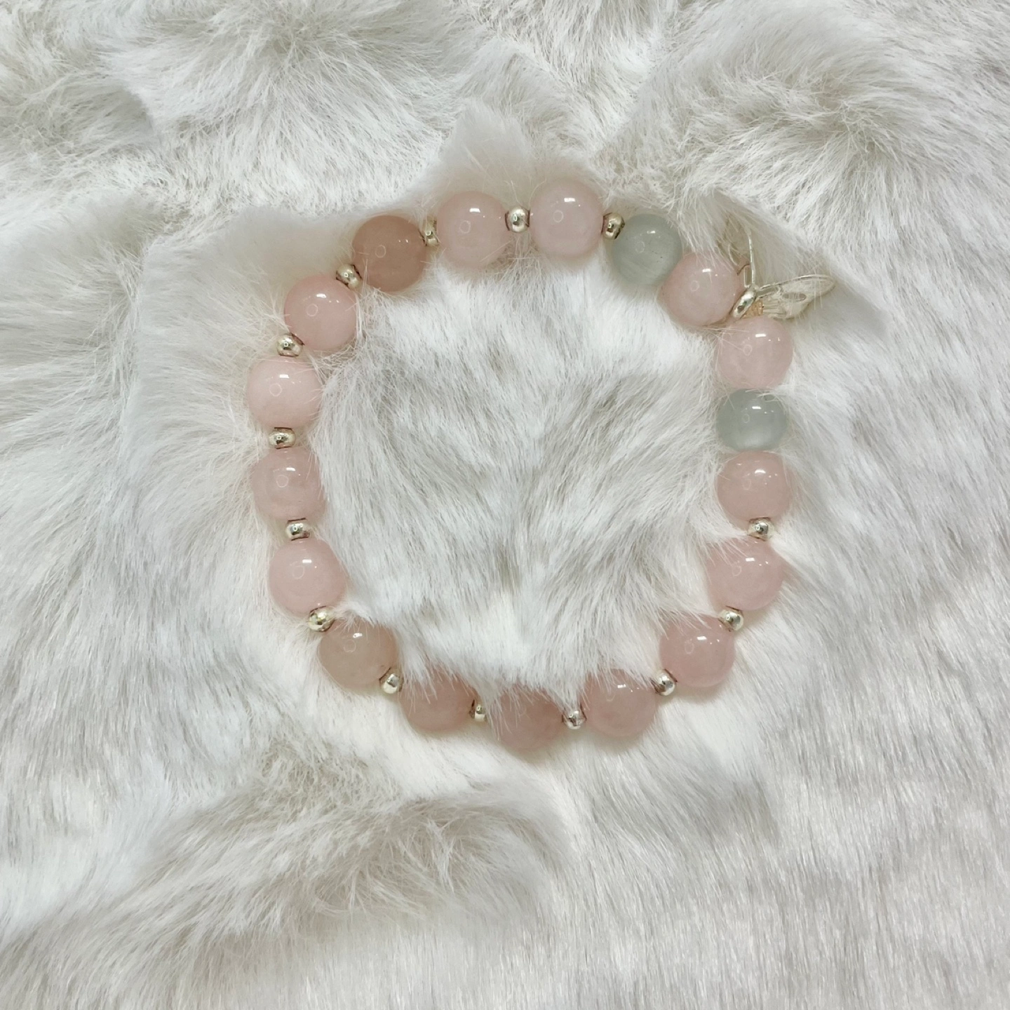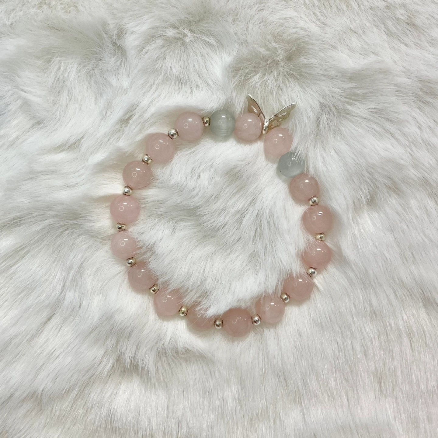 Pretty bracelet featuring pale pink and grey beads. Silver-toned metal accents and a charming butterfly clasp. Looks great on the wrist. Pickup locations are in Richmond Hill, Markham or DT Toronto. Delivery is also available